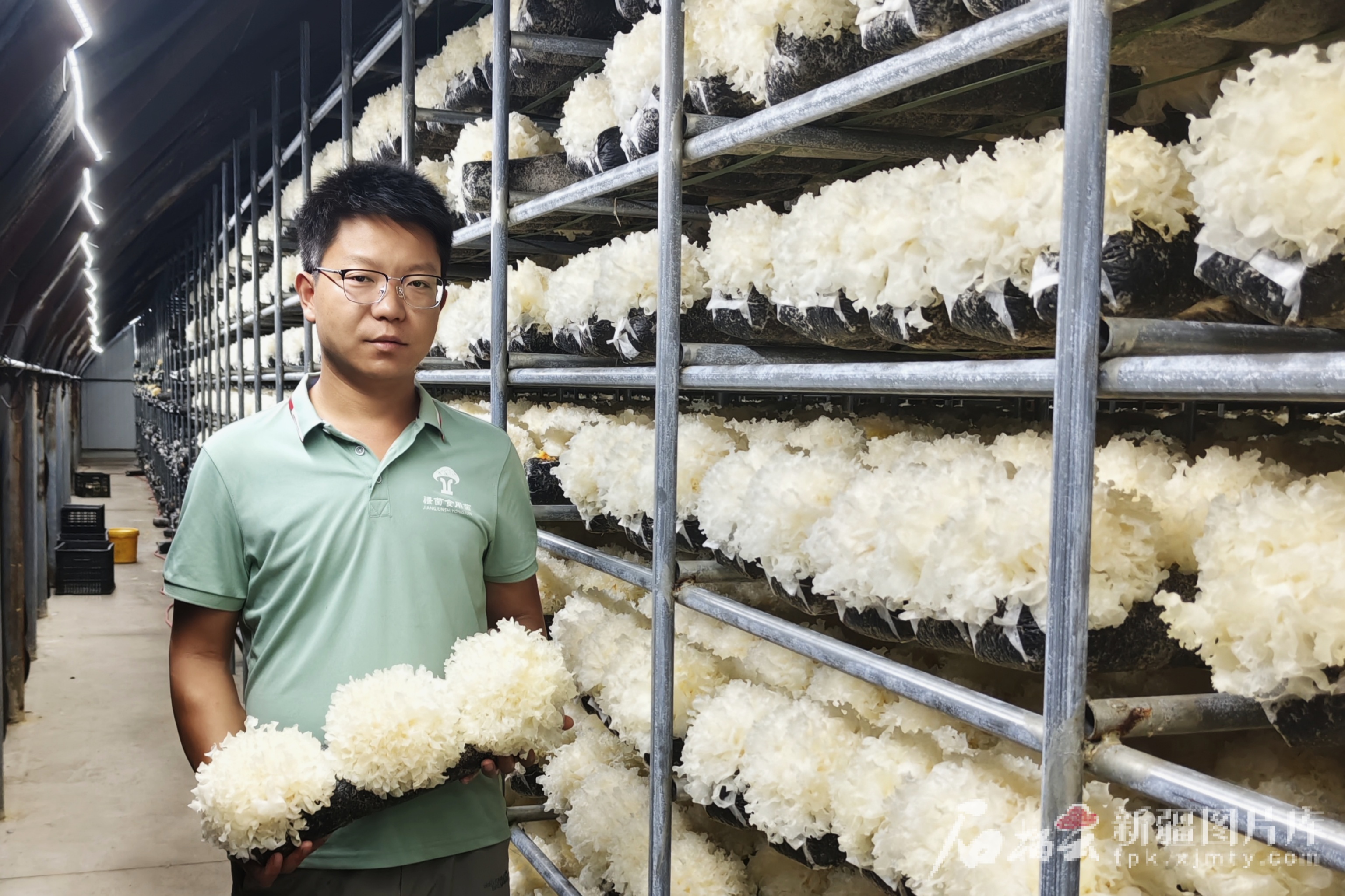 7月22日,在和靜縣疆菌食用菌專業(yè)合作社的智能恒溫棚,該合作社理事長周波展示他種植的銀耳。夏歡攝