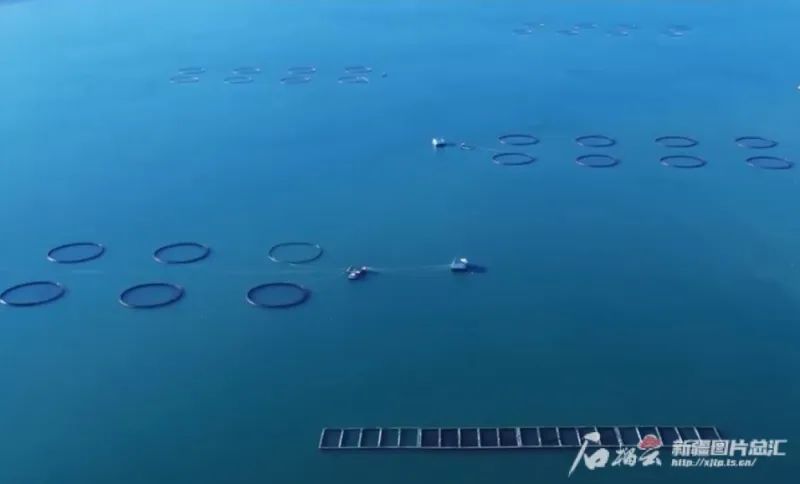 俯瞰伊犁哈薩克自治州尼勒克縣三文魚養(yǎng)殖基地,圓形養(yǎng)殖網(wǎng)箱錯落有致地分布在天然水庫之中(資料圖)。趙學林攝