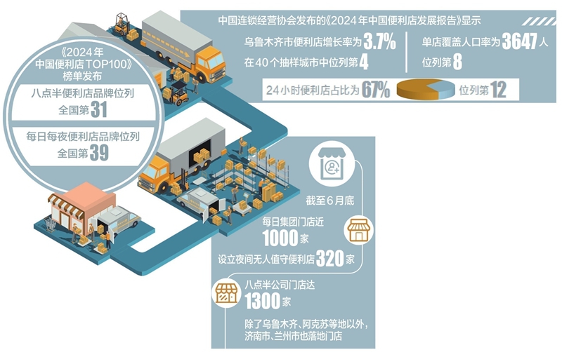 近年來,我國便利店數(shù)量、銷售額持續(xù)增長(zhǎng)。中國連鎖經(jīng)營協(xié)會(huì)發(fā)布的《2024年中國便利店發(fā)展報(bào)告》顯示,烏魯木齊市便利店增長(zhǎng)率為3.7%,在40個(gè)抽樣城市中位列第4;單店覆蓋人口率為3647人,位列第8;24小時(shí)便利店占比為67%,位列第12。