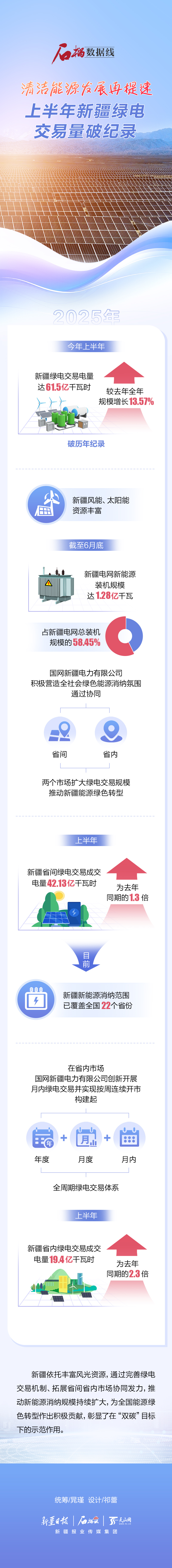 今年上半年,新疆綠電交易電量達61.5億千瓦時,較去年全年規(guī)模增長13.57%,破歷年紀錄。