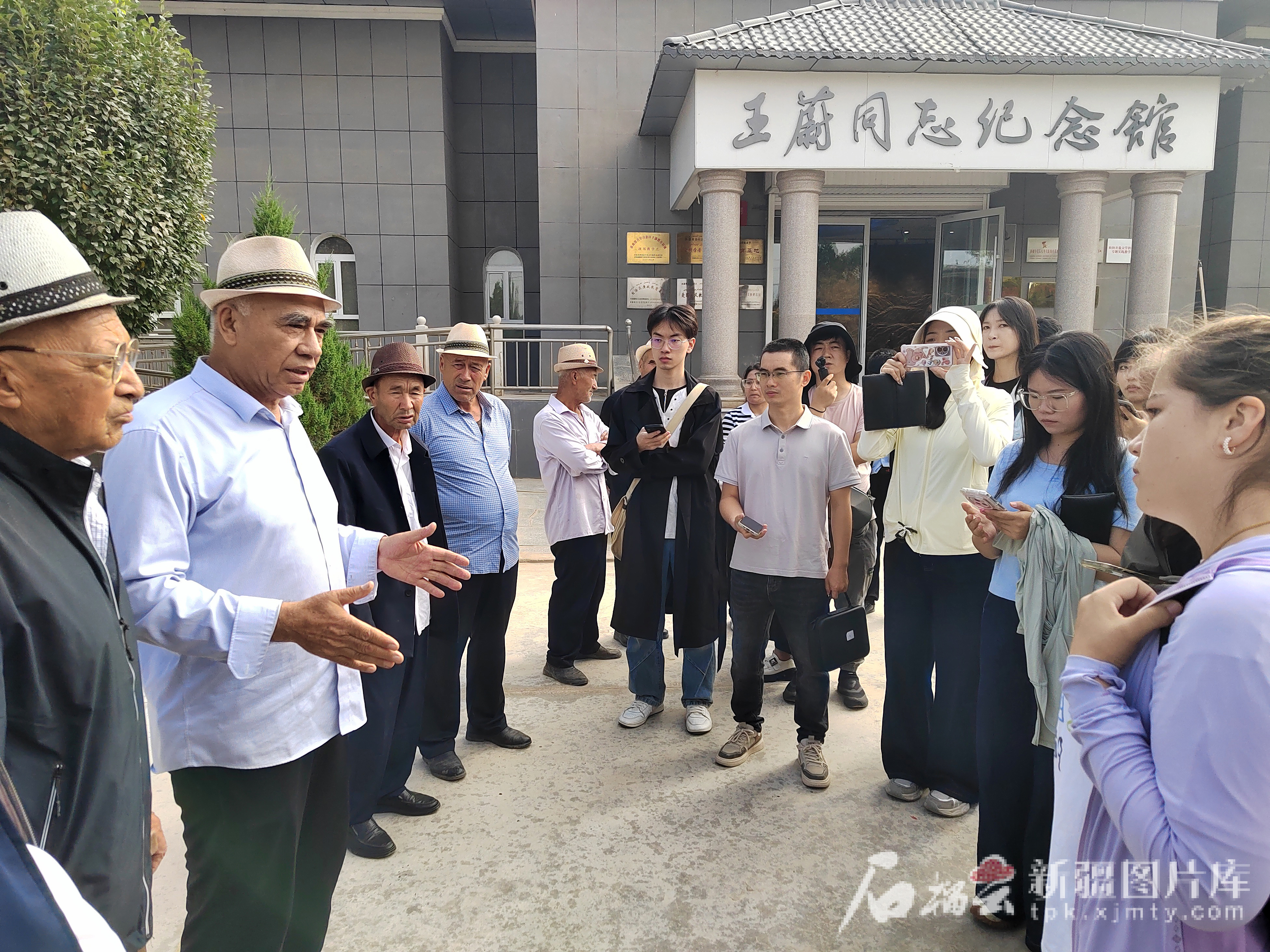 8月6日,和田縣水利局退休干部麥麥提·麥色依提(左二)給采訪團一行講述自己和王蔚共同經(jīng)歷的往事。