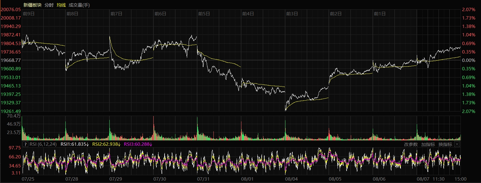 8月7日收盤時(shí),新疆板塊指數(shù)漲0.53%,報(bào)收19773.24點(diǎn),35只股票上漲,24只股票下跌,2只股票平盤,個(gè)股上漲比例為57.38%,總換手率1.43%,總成交額122.40億元。