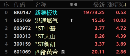 今日,洪通燃?xì)馍蠞q10.03%,報(bào)收15.36元;*ST中基上漲4.72%,報(bào)收3.77元;*ST天山上漲4.39%,報(bào)收9.28元;*ST新研上漲3.69%,報(bào)收3.37元;西部黃金上漲2.86%,報(bào)收20.11元。德新科技、德展健康、百花醫(yī)藥、渤海租賃、寶地礦業(yè)跌幅居前。