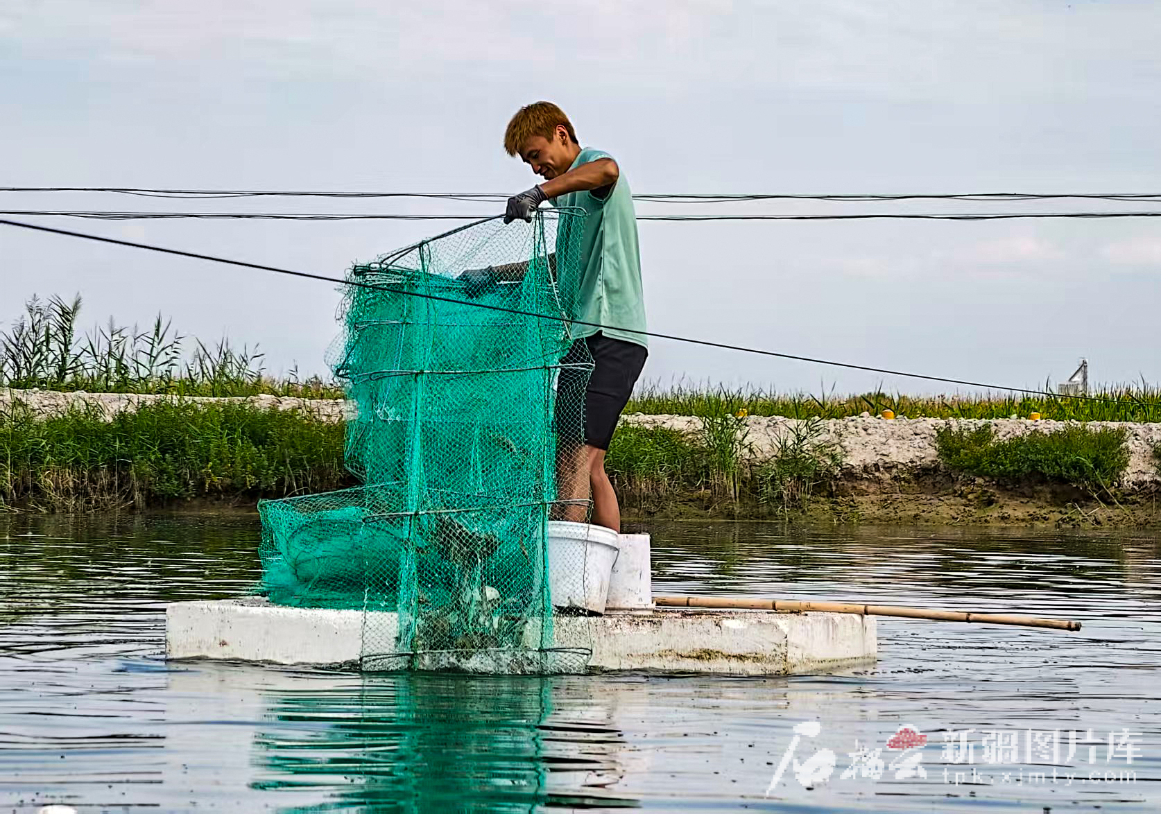 8月8日,養(yǎng)殖戶在察布查爾錫伯自治縣坎鄉(xiāng)稻蟹養(yǎng)殖基地捕撈養(yǎng)殖的蝦。