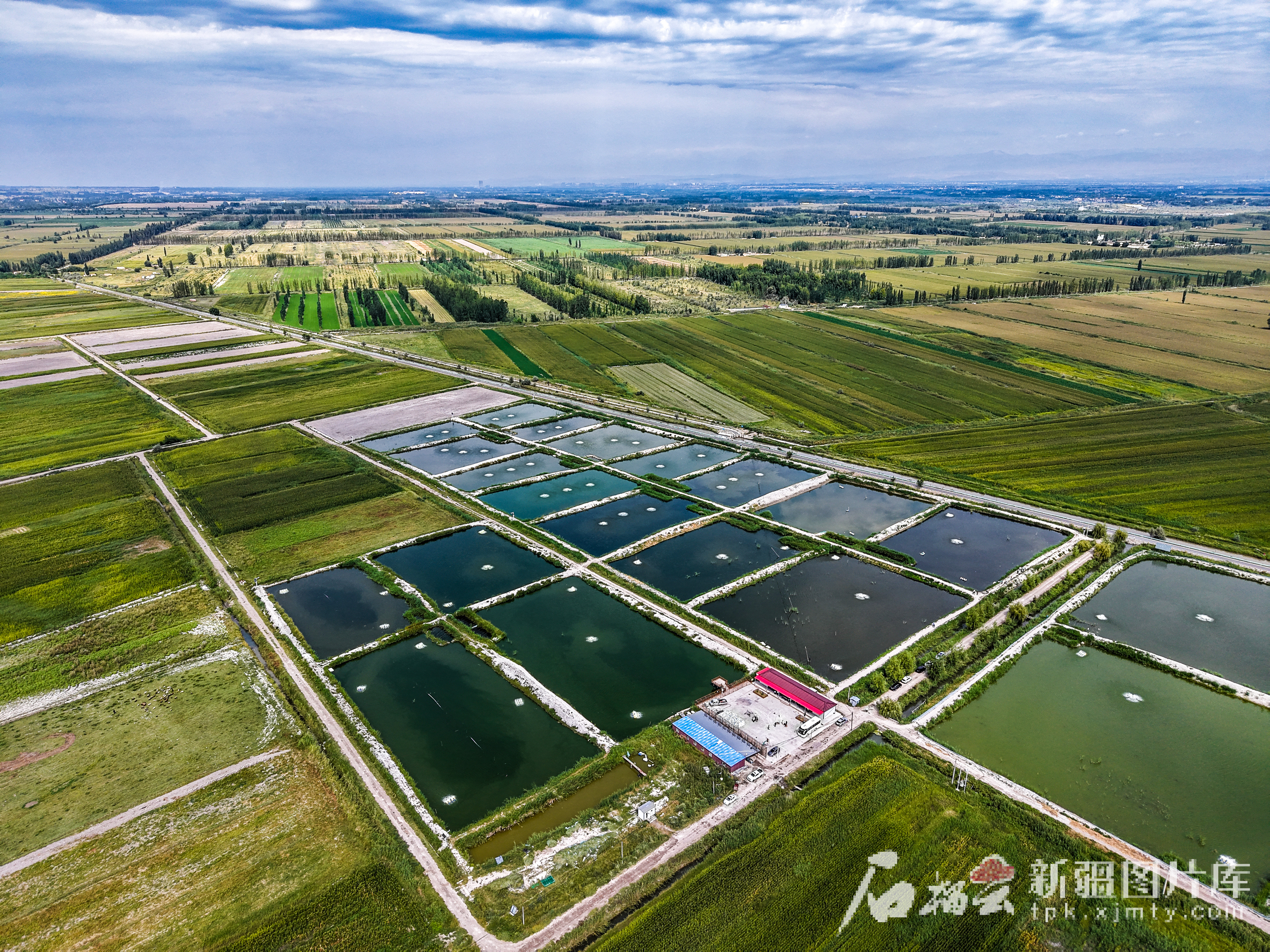 8月8日,鳥瞰察布查爾錫伯自治縣坎鄉(xiāng)稻蟹養(yǎng)殖基地。(無人機(jī)攝)