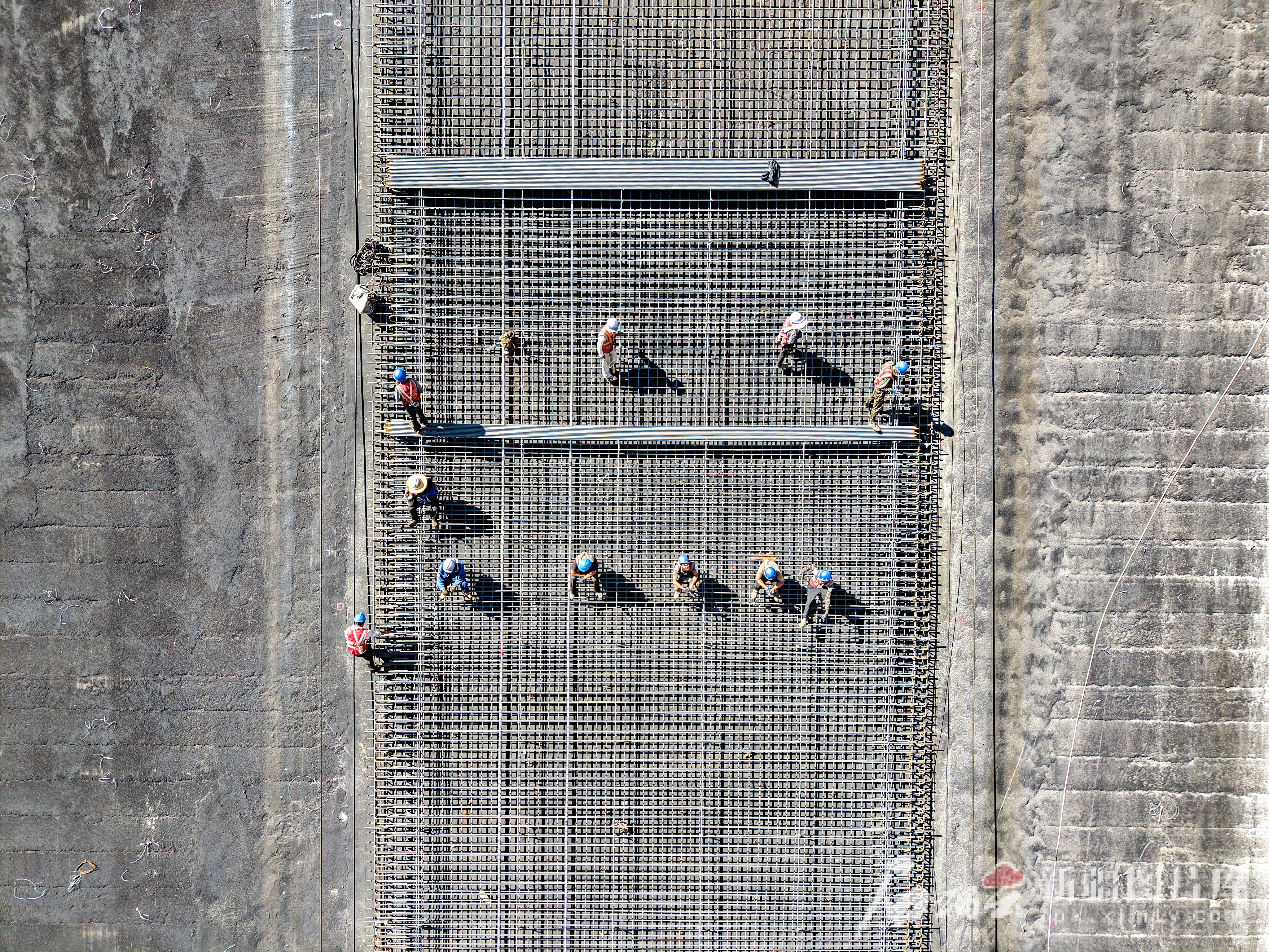 8月9日,工人在混凝土面板砂礫石壩上施工。