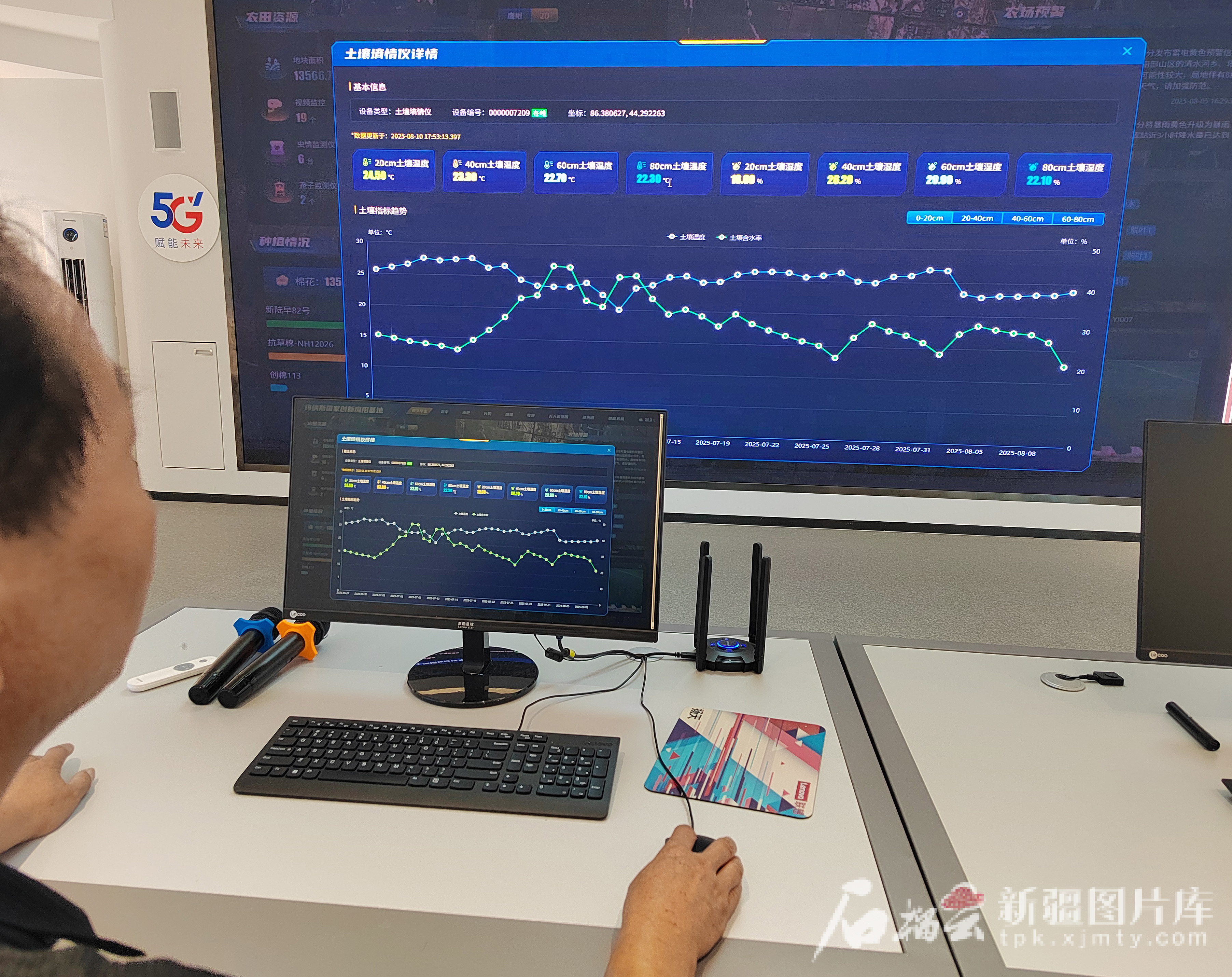 8月10日,工作人員通過瑪納斯國家數(shù)字種植業(yè)創(chuàng)新應(yīng)用基地管理平臺(tái)查看土壤墑情。
