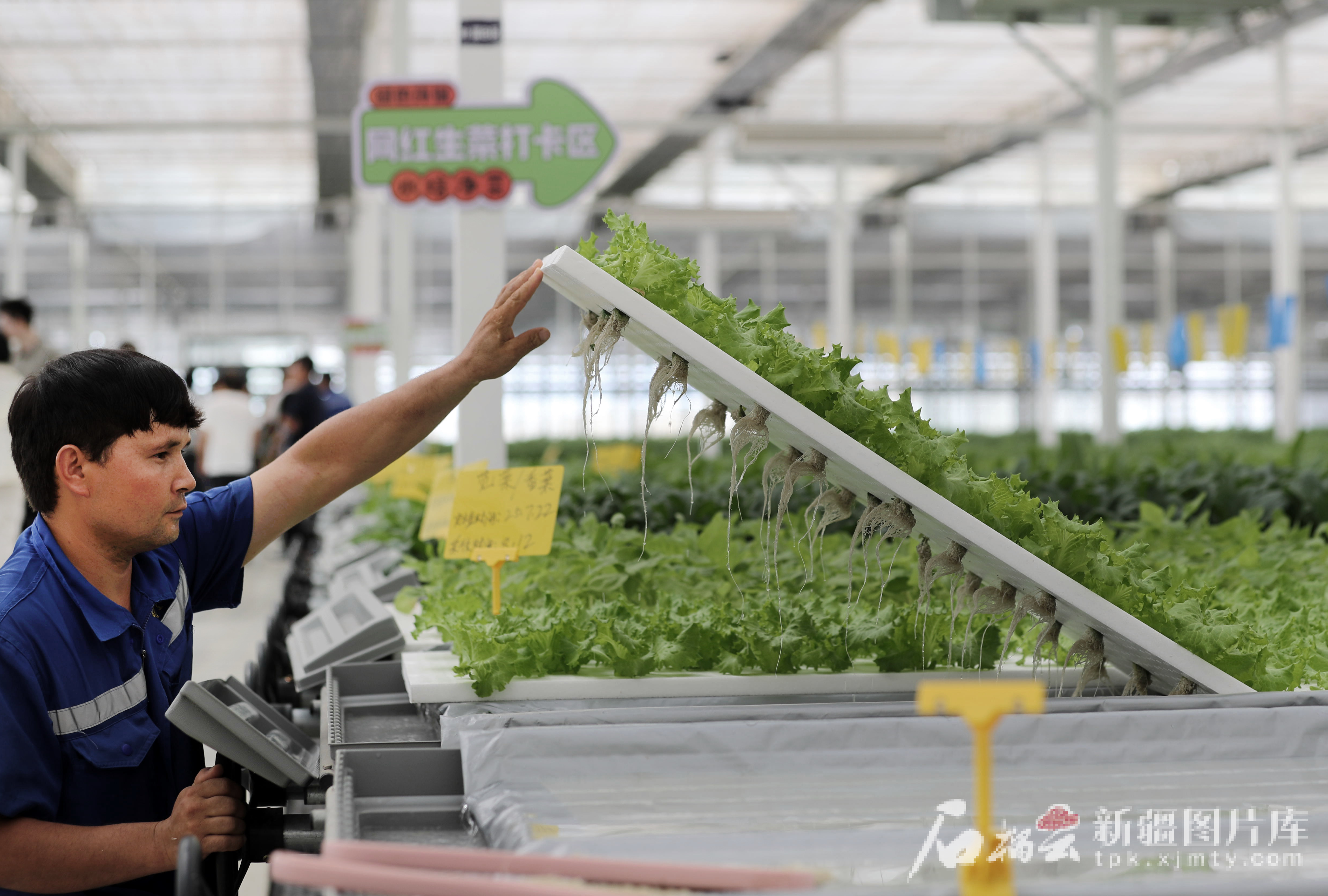 8月13日,工作人員在檢查葉菜生長(zhǎng)情況。