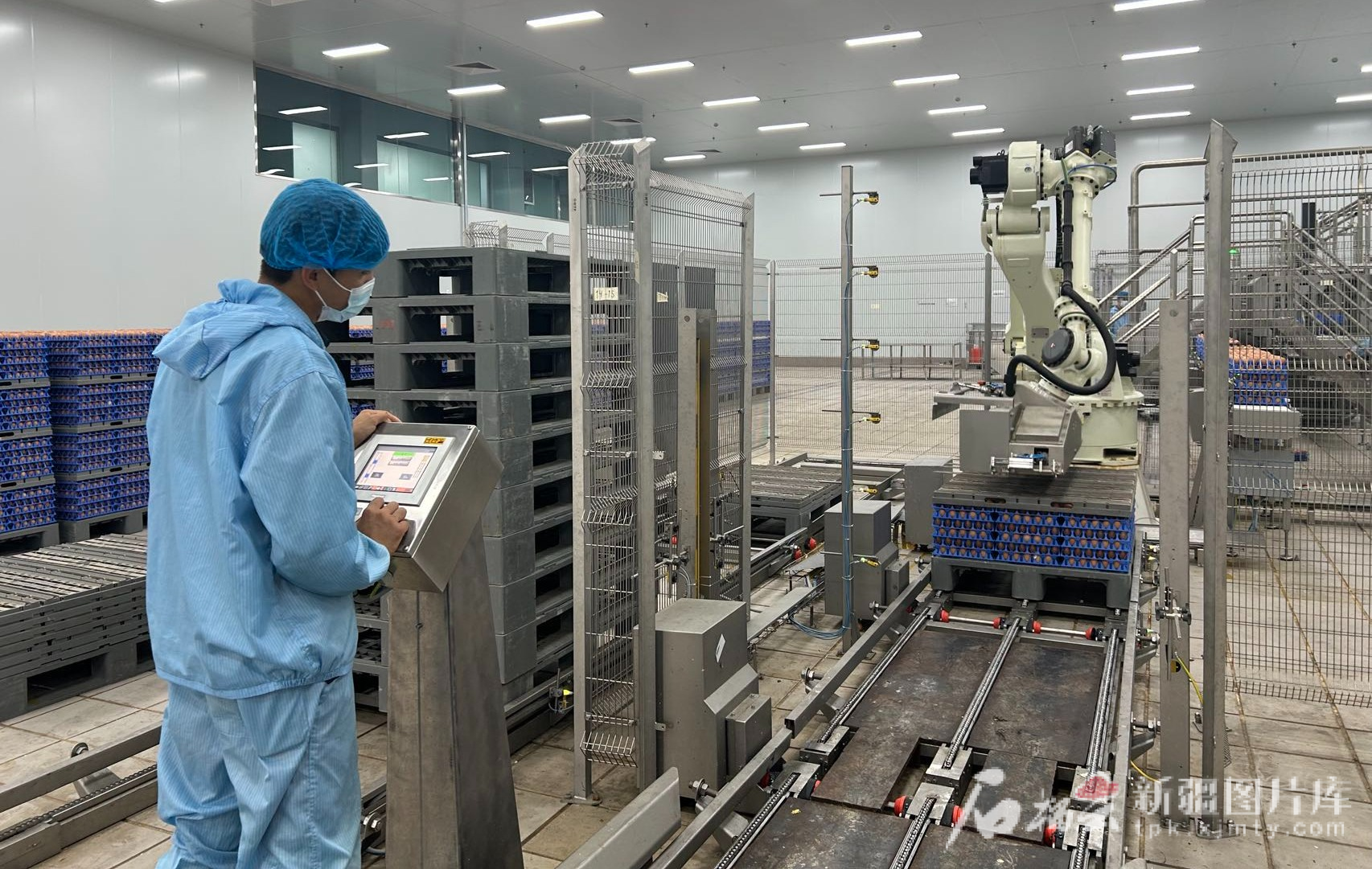 8月14日,新疆西帕健康食品有限公司員工在查看機械臂運作情況。天山網(wǎng)-新疆日報記者 宋衛(wèi)國攝