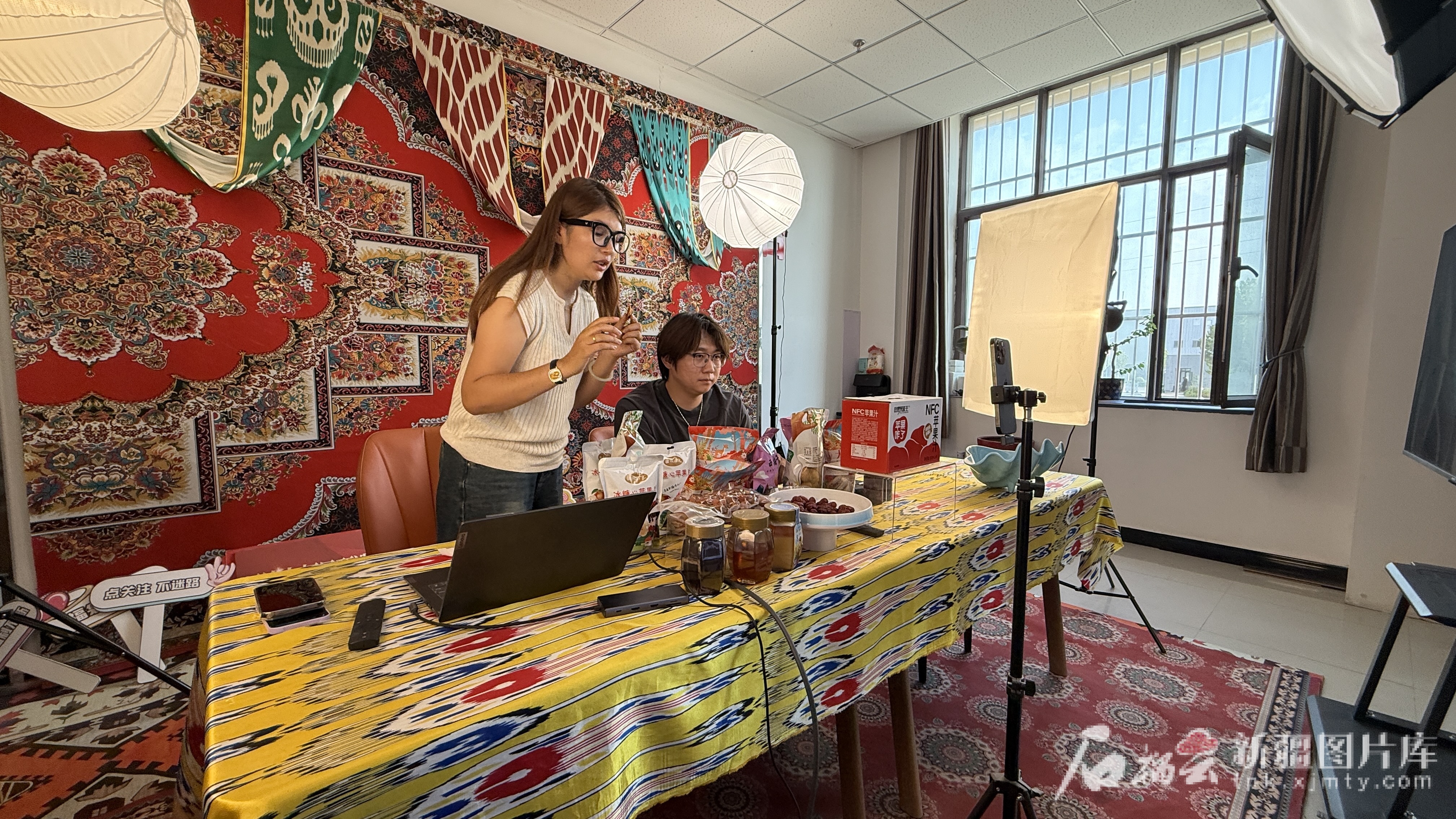 8月13日,在阿克蘇市電商創(chuàng)業(yè)孵化基地演播室,主播正在推介當(dāng)?shù)剞r(nóng)副產(chǎn)品。天山網(wǎng)-新疆日?qǐng)?bào)記者 拍熱扎提·阿不都 攝