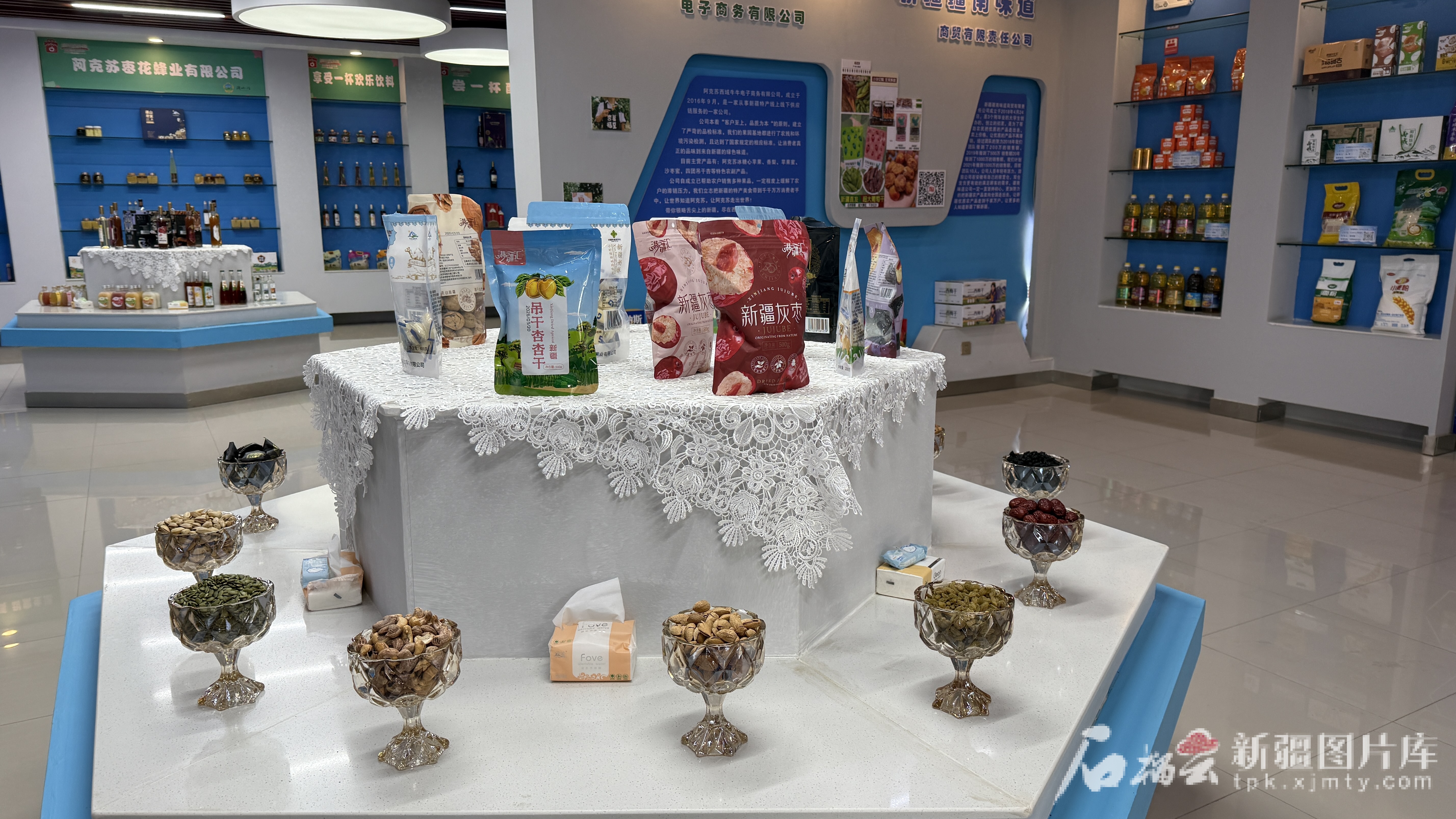 8月13日,阿克蘇市電商產(chǎn)業(yè)園內(nèi)農(nóng)產(chǎn)品展示廳里,入駐企業(yè)展示的各類(lèi)農(nóng)副產(chǎn)品。天山網(wǎng)-新疆日?qǐng)?bào)記者 拍熱扎提·阿不都 攝