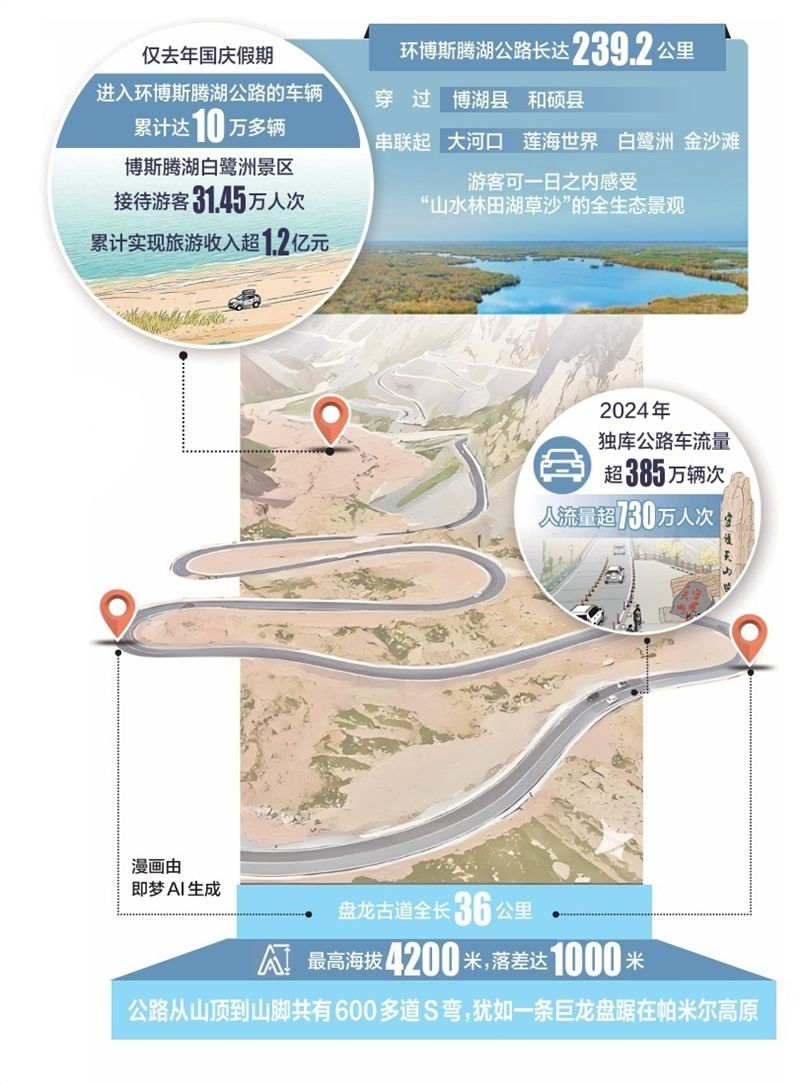 環(huán)博斯騰湖公路開(kāi)通后即新晉“網(wǎng)紅公路”。僅去年國(guó)慶假期,進(jìn)入環(huán)博斯騰湖公路的車(chē)輛累計(jì)達(dá)10萬(wàn)多輛;博斯騰湖白鷺洲景區(qū)接待游客31.45萬(wàn)人次,累計(jì)實(shí)現(xiàn)旅游花費(fèi)超1.2億元。