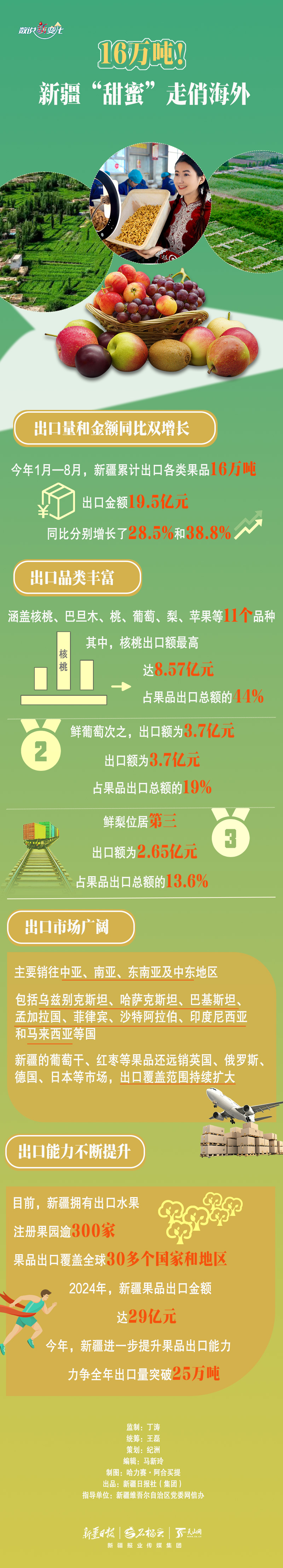 近年來,新疆持續(xù)推進林果業(yè)提質增效,果品品質顯著提升,商品果率穩(wěn)定在86%以上,為擴大出口奠定堅實基礎。今年1月—8月,新疆果品出口快速增長,“甜蜜產業(yè)”海外走俏。哪些水果暢銷海外?主要銷往哪些地區(qū)和國家?今天的《“數”說新變化》一起來了解。