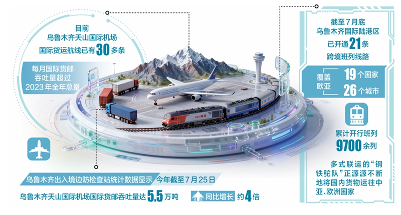 目前,烏魯木齊天山國際機(jī)場國際貨運(yùn)航線已有30多條,每月國際貨郵吞吐量均超2023年全年總量;今年7月27日開通的烏魯木齊—巴黎/馬德里貨運(yùn)航線,為中國西部與歐洲核心市場首次建立常態(tài)化航空貨運(yùn)紐帶,對深化中歐經(jīng)貿(mào)合作具有重要現(xiàn)實意義。