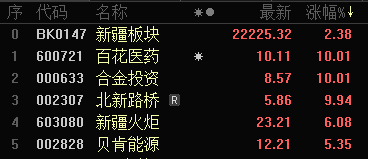 11月28日新疆板塊股價漲幅排名。(來源:東方財富)