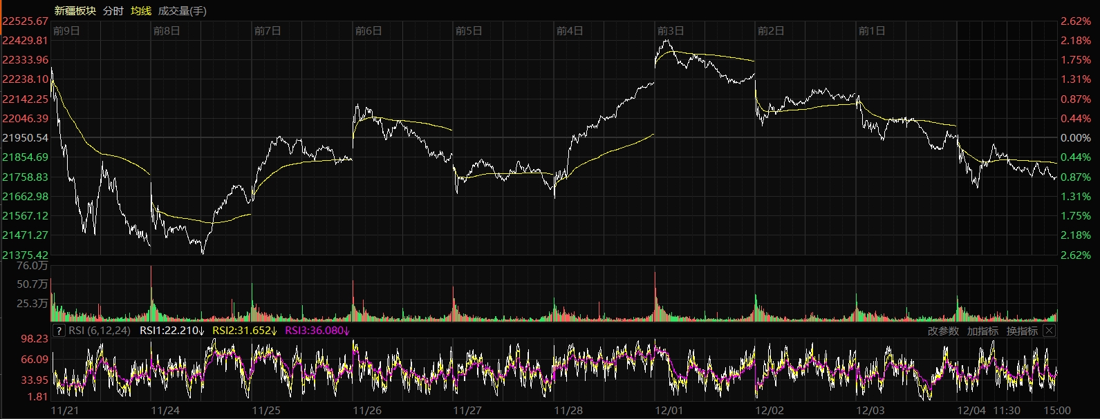 12月4日收盤時,新疆板塊指數跌0.90%,報收21752.45點,13只股票上漲,46只股票下跌,2只股票平盤,個股上漲比例為21.31%,總換手率1.47%,總成交額148.02億元。