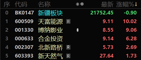 12月4日新疆板塊股價漲幅排名。(來源:東方財富)