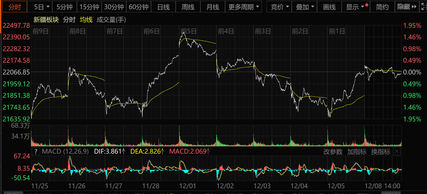 12月8日收盤時,新疆板塊指數(shù)跌0.06%,報收22053.19點,23只股票上漲,38只股票下跌,0只股票平盤,個股上漲比例為37.70%,總換手率1.60%,總成交額169.39億元。