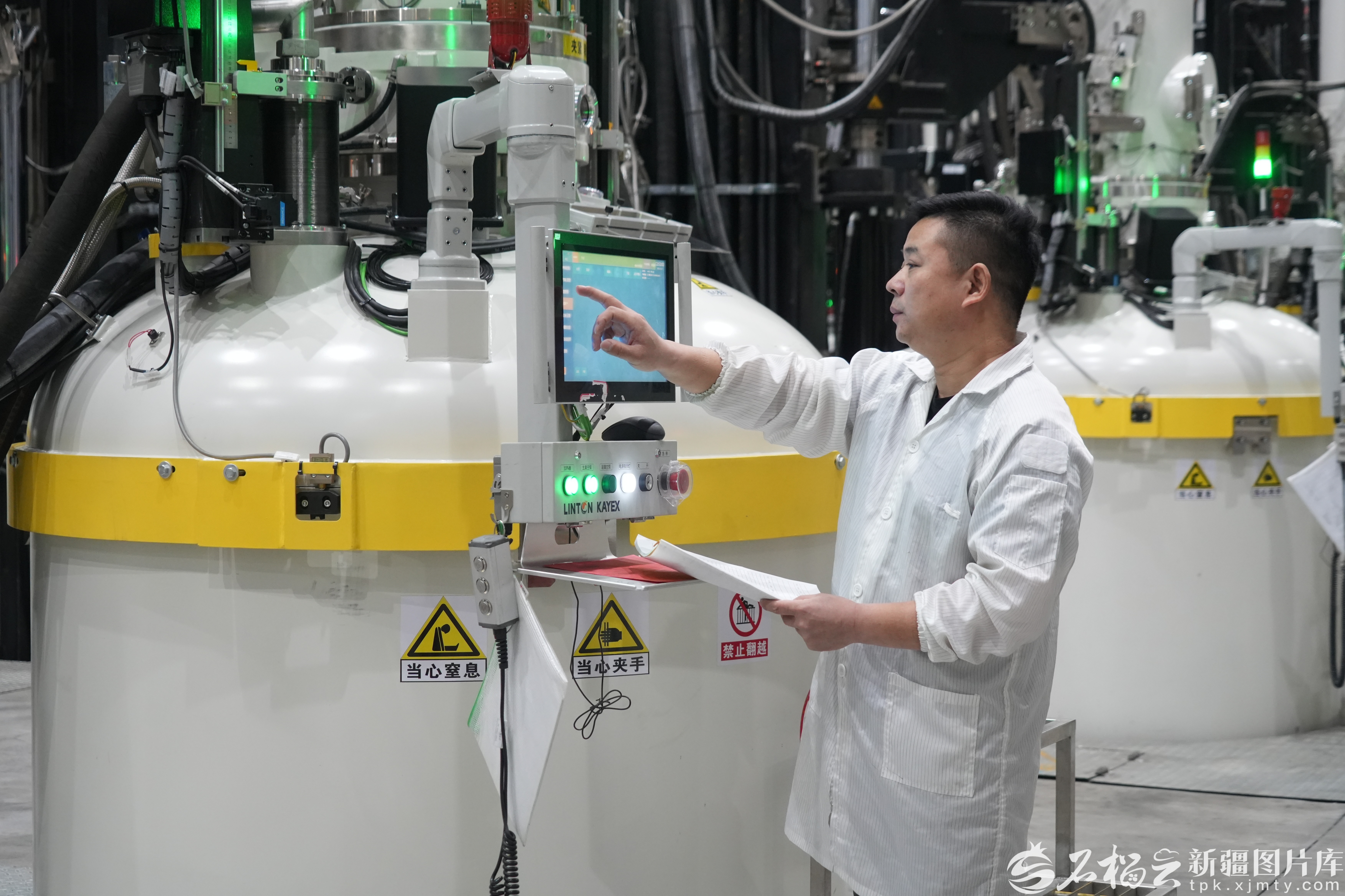 12月12日,工作人員在位于哈密高新技術(shù)產(chǎn)業(yè)開(kāi)發(fā)區(qū)的清電硅業(yè)年產(chǎn)40吉瓦單晶硅拉棒切片一期10吉瓦項(xiàng)目生產(chǎn)車(chē)間生產(chǎn)來(lái)自安徽、山東等地的訂單。作為新疆首個(gè)高效N型大尺寸單晶硅項(xiàng)目,可年產(chǎn)2.9萬(wàn)噸單晶硅棒。 郭子毅攝
