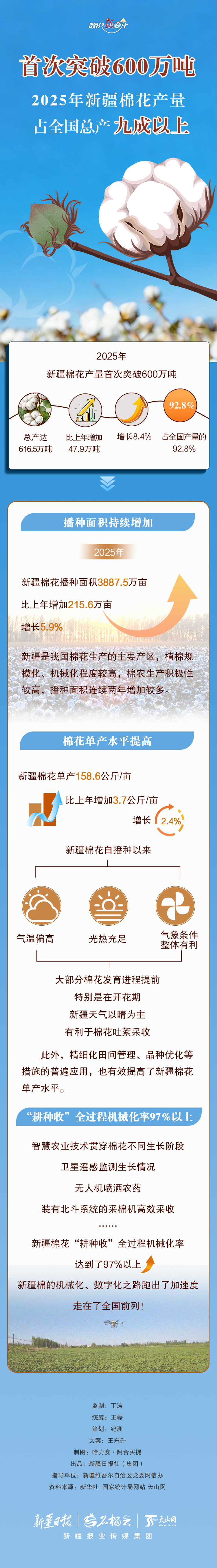 近日,國(guó)家統(tǒng)計(jì)局發(fā)布2025年棉花產(chǎn)量公告,新疆棉花產(chǎn)量首次突破600萬(wàn)噸,總產(chǎn)達(dá)616.5萬(wàn)噸,占全國(guó)產(chǎn)量的92.8%。豐收背后有哪些關(guān)鍵因素支撐?本期《數(shù)說(shuō)“新”變化》帶你一同解讀。