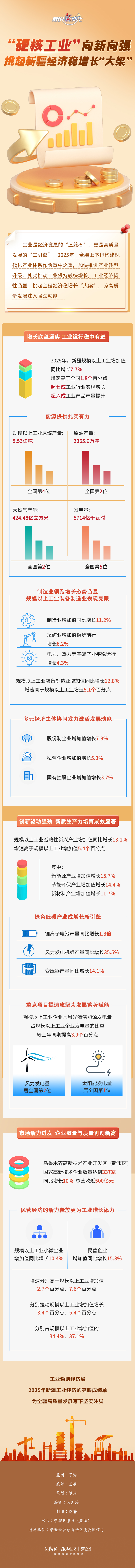 2025年,新疆把構建現(xiàn)代化產(chǎn)業(yè)體系作為重點任務,持續(xù)推動產(chǎn)業(yè)轉型升級,工業(yè)經(jīng)濟實現(xiàn)較快增長,韌性顯著增強,挑起新疆經(jīng)濟穩(wěn)增長“大梁”,為高質(zhì)量發(fā)展注入強勁動力。本期《數(shù)說“新”變化》為您解讀2025年新疆工業(yè)經(jīng)濟發(fā)展的亮點與特征。