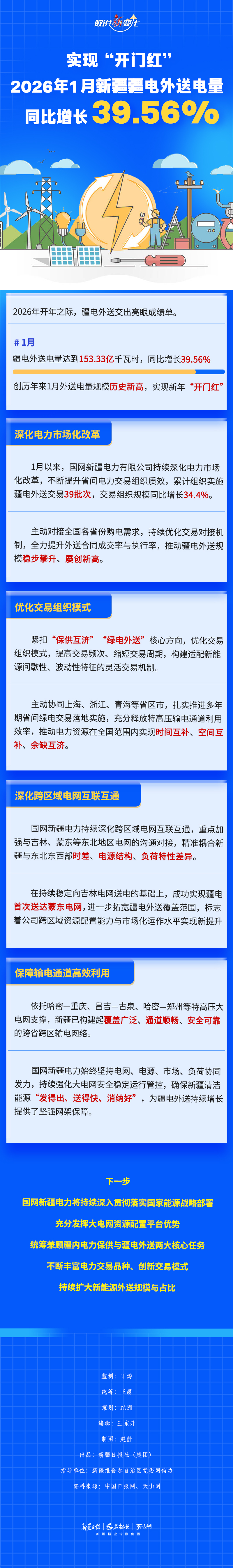 2026年1月,新疆疆電外送電量達到153.33億千瓦時,同比增長39.56%。這一優(yōu)異成績是如何取得的?本期《數(shù)說“新”變化》一起來看看。
