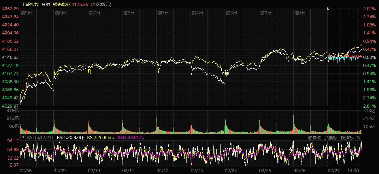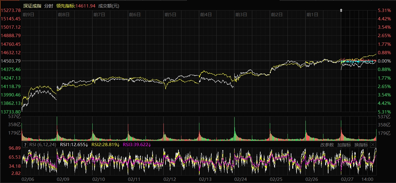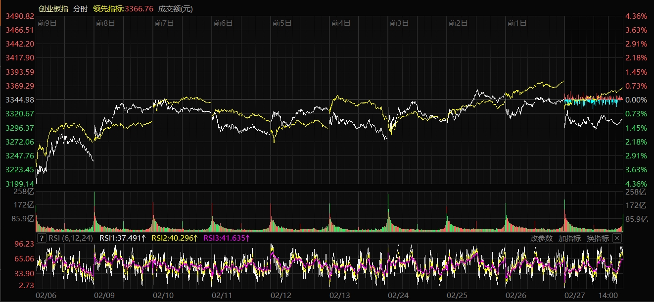 天山網(wǎng)-新疆日報訊(記者趙悅報道)2月27日,A股三大指數(shù)漲跌不一。截至收盤,滬指漲0.39%,報收4162.88點;深證成指跌0.06%,報收14495.09點;創(chuàng)業(yè)板指跌1.04%,報收3310.30點。滬深京三市成交額達到2.51萬億元,較昨日小幅縮量504億元。