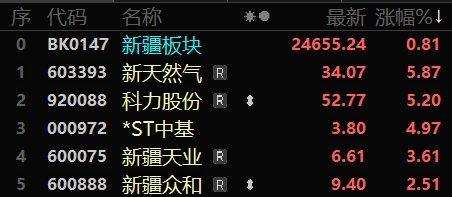 今日,新天然氣上漲5.87%,報收34.07元;科力股份上漲5.20%,報收52.77元;*ST中基上漲4.97%,報收3.80元;新疆天業(yè)上漲3.61%,報收6.61元;新疆眾和上漲2.51%,報收9.40元。新賽股份、博納影業(yè)、準(zhǔn)油股份、麥趣爾、特變電工跌幅居前。