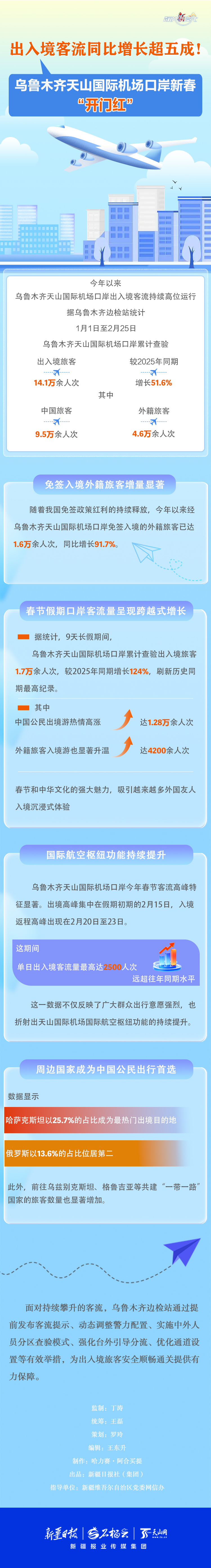 據(jù)烏魯木齊邊檢站統(tǒng)計,1月1日至2月25日,烏魯木齊天山國際機場口岸累計查驗出入境旅客14.1萬余人次,較2025年同期增長51.6%。這一顯著增長背后,得益于哪些有利因素?口岸客流量攀升的原因是什么?本期《數(shù)說“新”變化》為您解析。