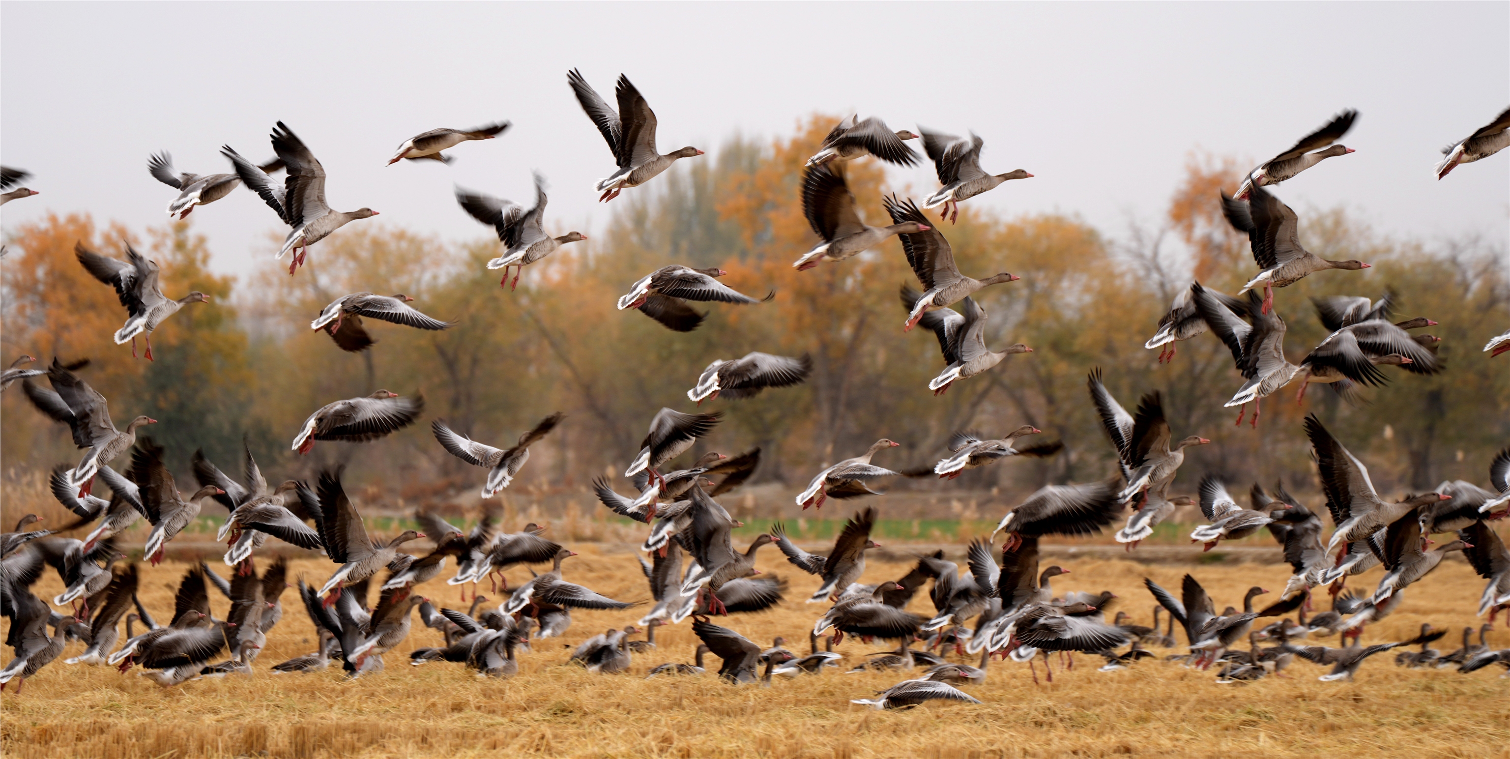 2022年11月9日,一群大雁在新疆生產建設兵團第一師三團水稻田棲息。 王志清 攝