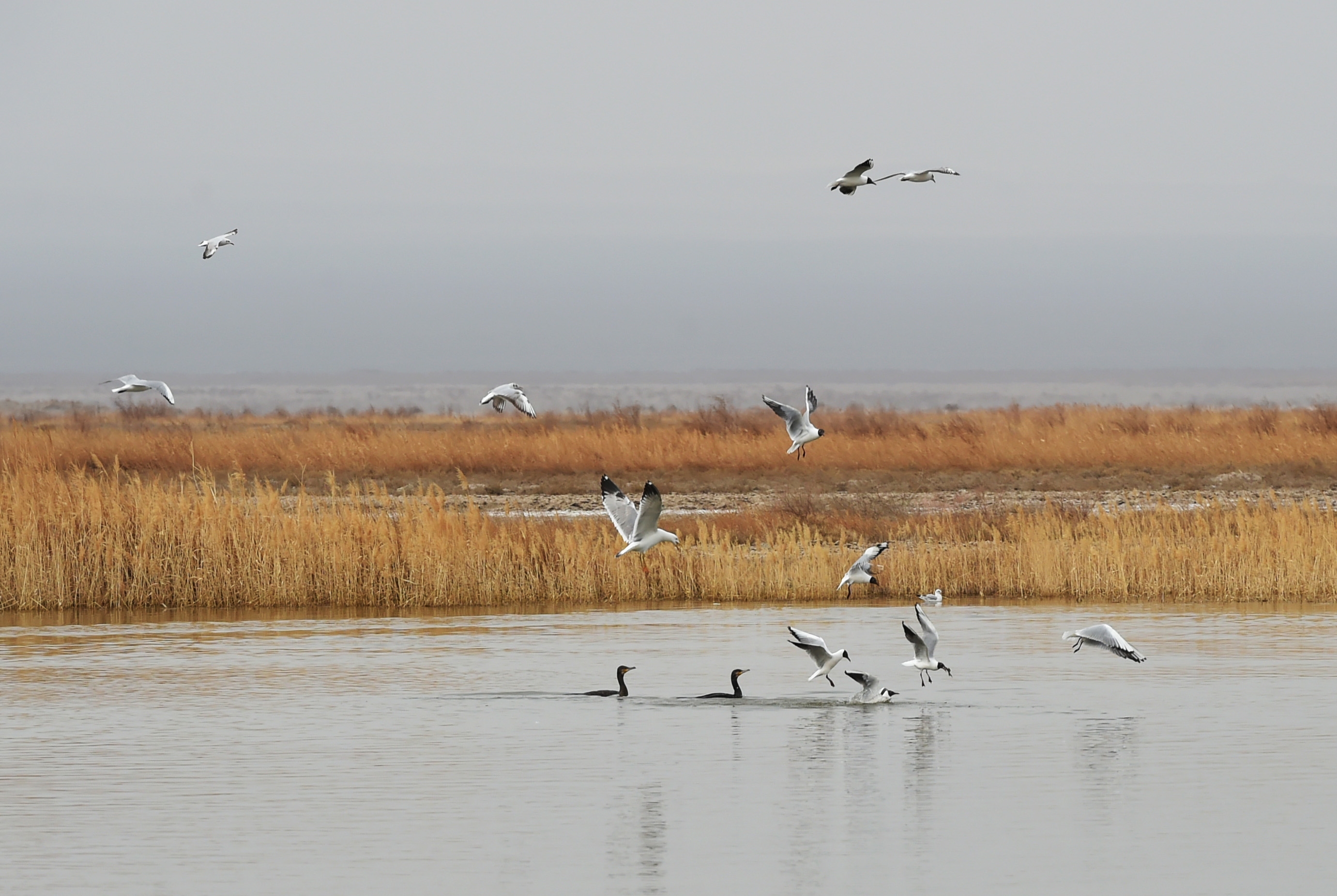 2022年3月20日,水鳥在艾丁湖濕地飛翔。 劉健攝
