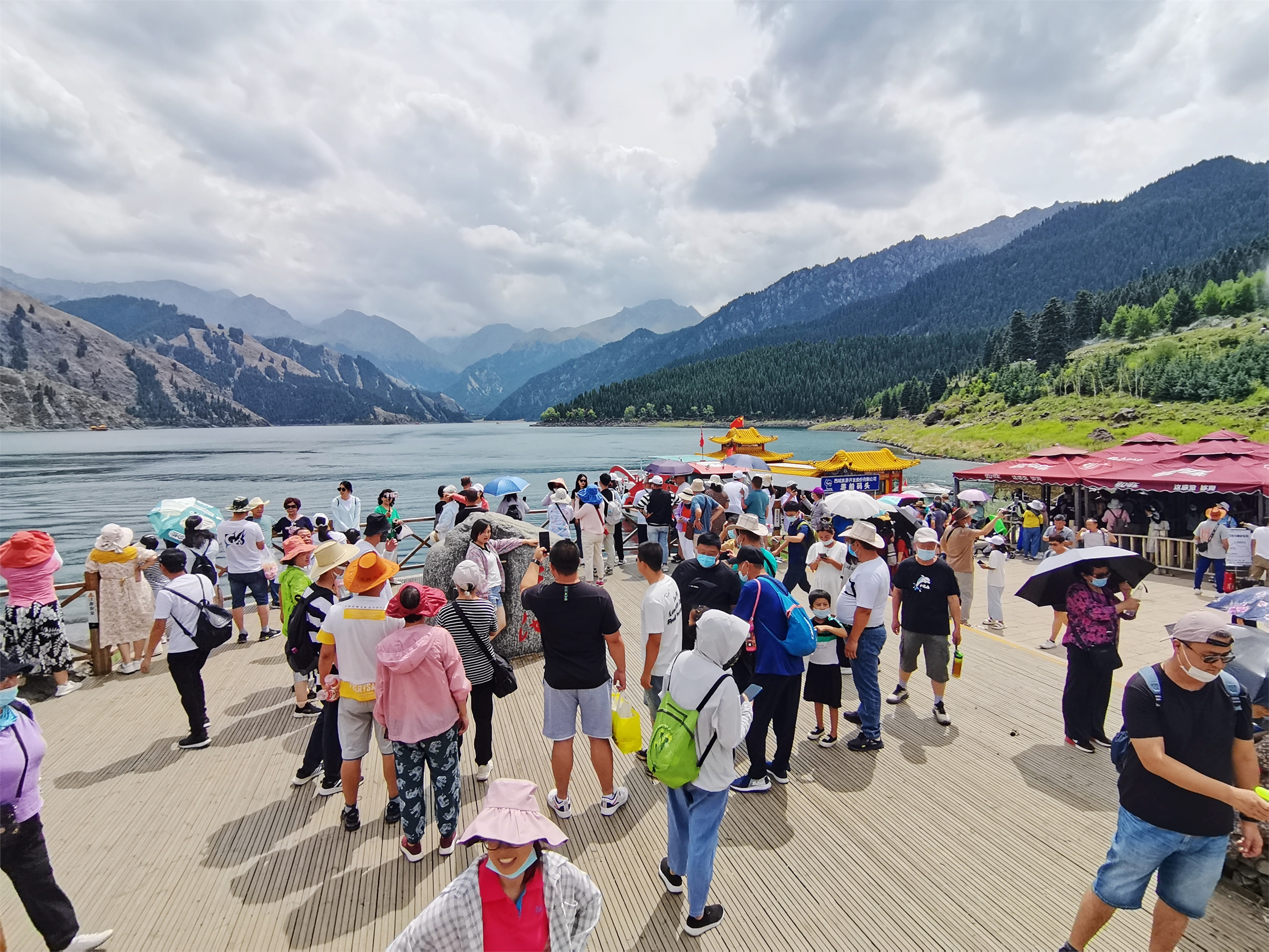2022年8月2日,游客在天山天池景區(qū)游覽。李小周 攝