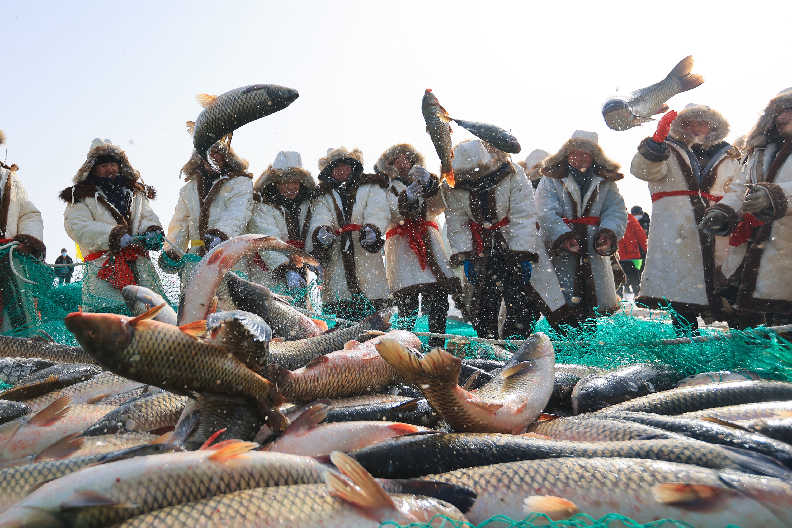 1月15日,漁民在博湖縣博斯騰湖冰面上冬捕作業(yè)。年磊攝