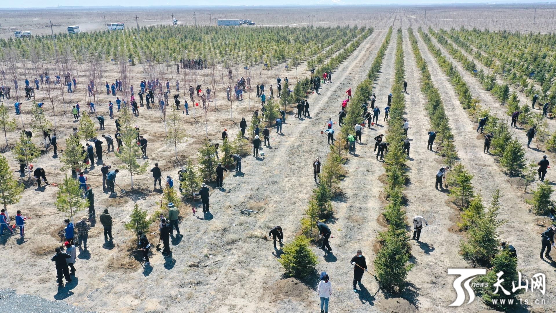 2021年4月14日,烏魯木齊市各族群眾在烏魯木齊縣烏板、烏水公路兩側(cè)開展植樹造林。該市今年計劃新增綠化面積5050畝。天山網(wǎng)-新疆日報記者 湯永攝
