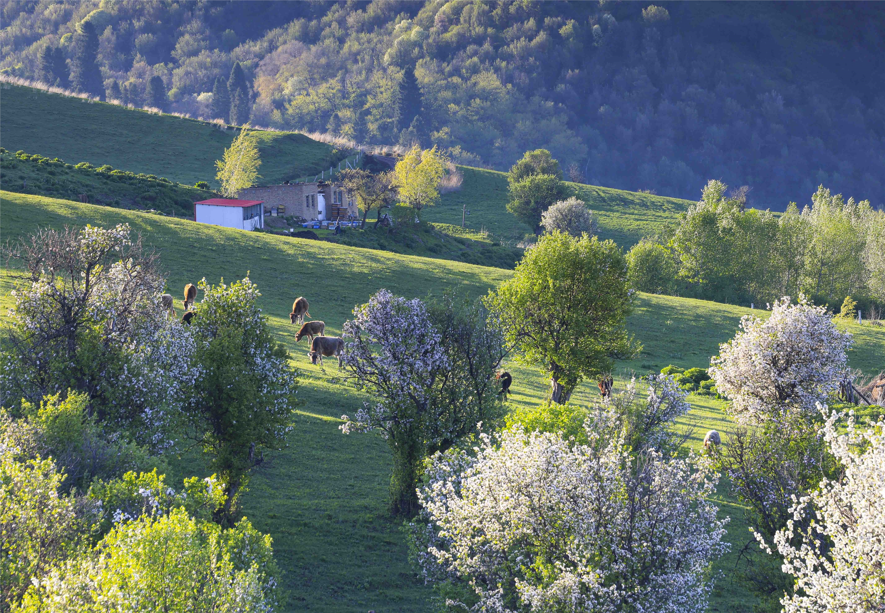 俯瞰新源縣薩哈景區(qū)中萬畝野生蘋果花(4月30無人機(jī)拍攝)。新源縣薩哈景區(qū)屬于原生態(tài)自然景觀,東西長50公里,南北寬10公里,地形為三山夾兩谷,景區(qū)內(nèi)分布著原始遺留下來的云杉、野蘋果林、野杏林等多種植物。每年從4月底開始,萬畝野果林繁花似錦,香氣遠(yuǎn)飄,讓人流連忘返。張文庭攝