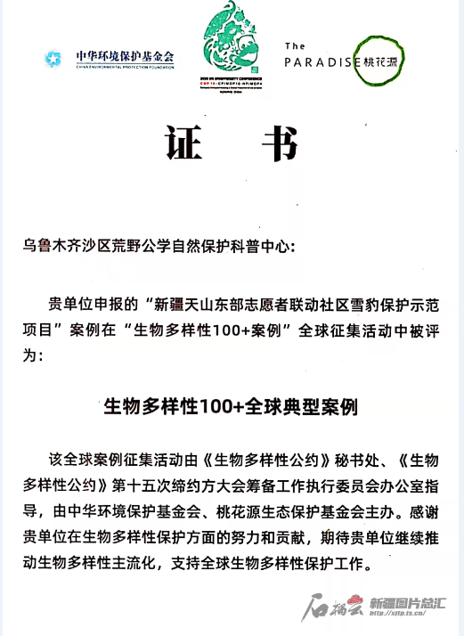 2021年,由新疆民間公益組織荒野新疆開(kāi)展的“新疆天山東部志愿者聯(lián)動(dòng)社區(qū)雪豹保護(hù)示范項(xiàng)目”獲評(píng)“生物多樣性100+全球典型案例”。圖 荒野新疆提供。