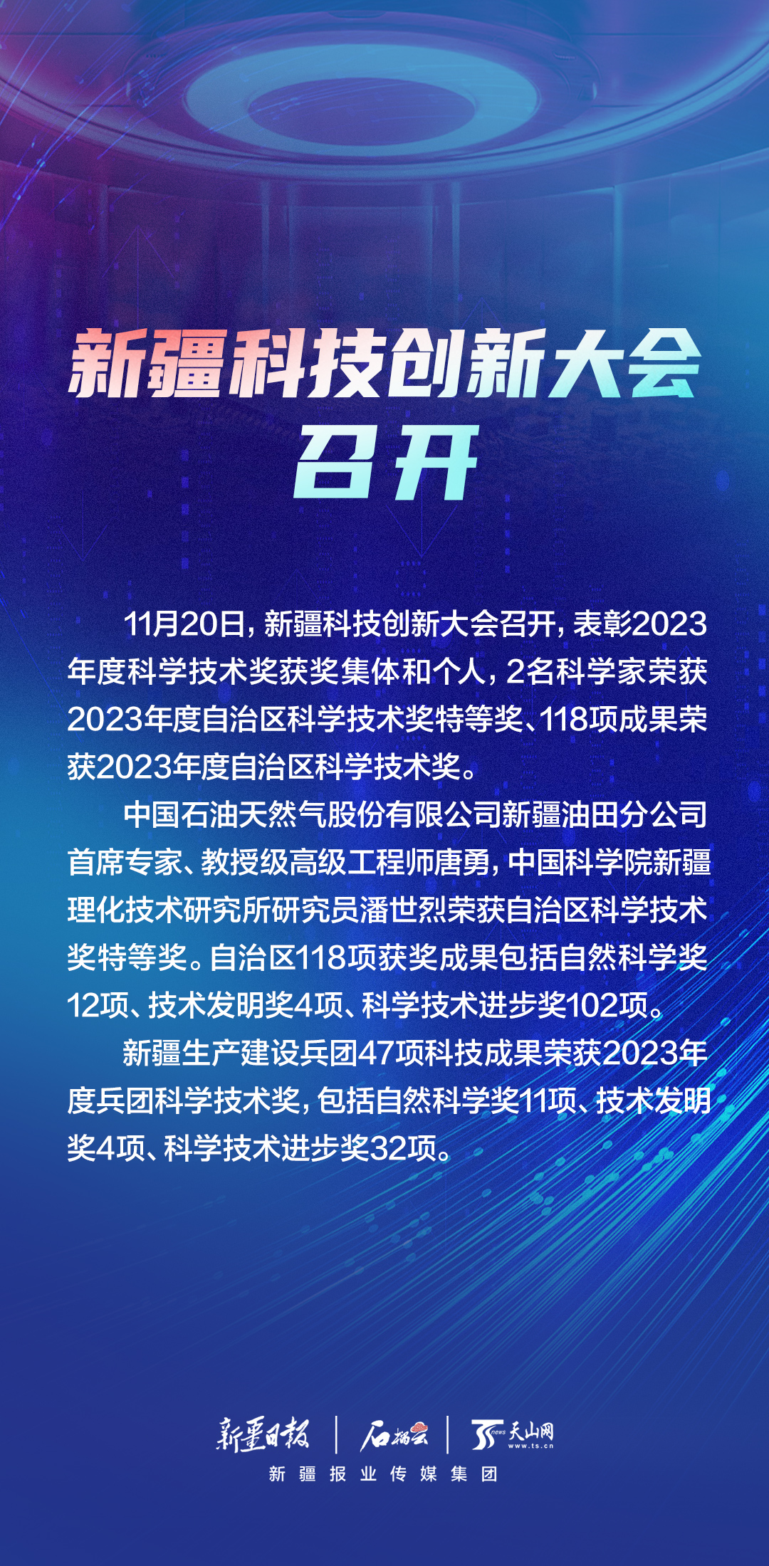 11月20日,新疆科技創(chuàng)新大會召開,表彰2023年度科學技術獎獲獎集體和個人,2名科學家榮獲2023年度自治區(qū)科學技術獎特等獎、118項成果榮獲2023年度自治區(qū)科學技術獎。
