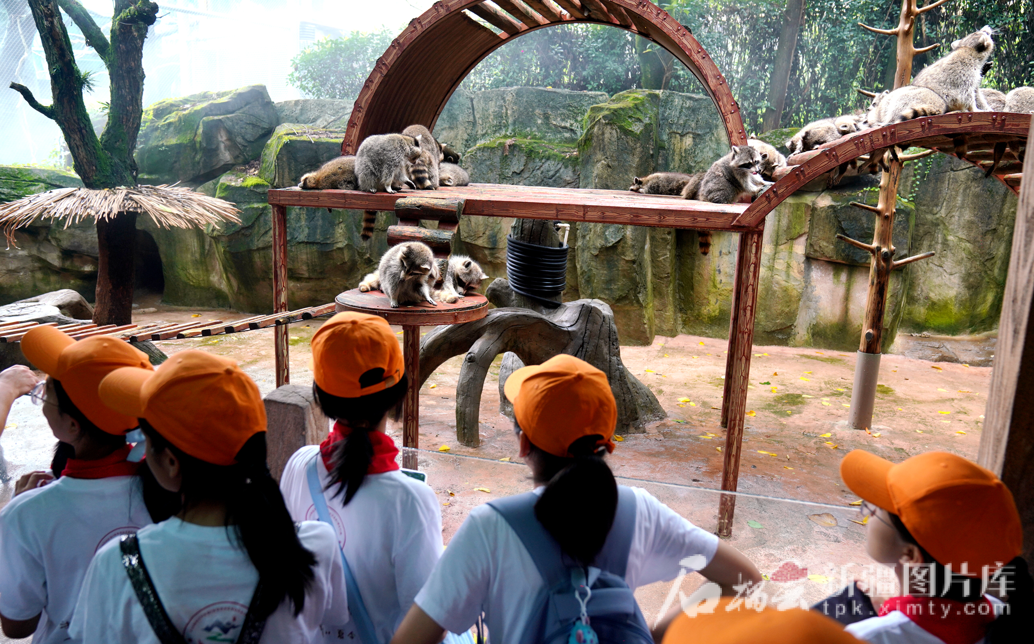 7月11日,在杭州野生動物世界,小伙伴們觀察浣熊的生活習性。