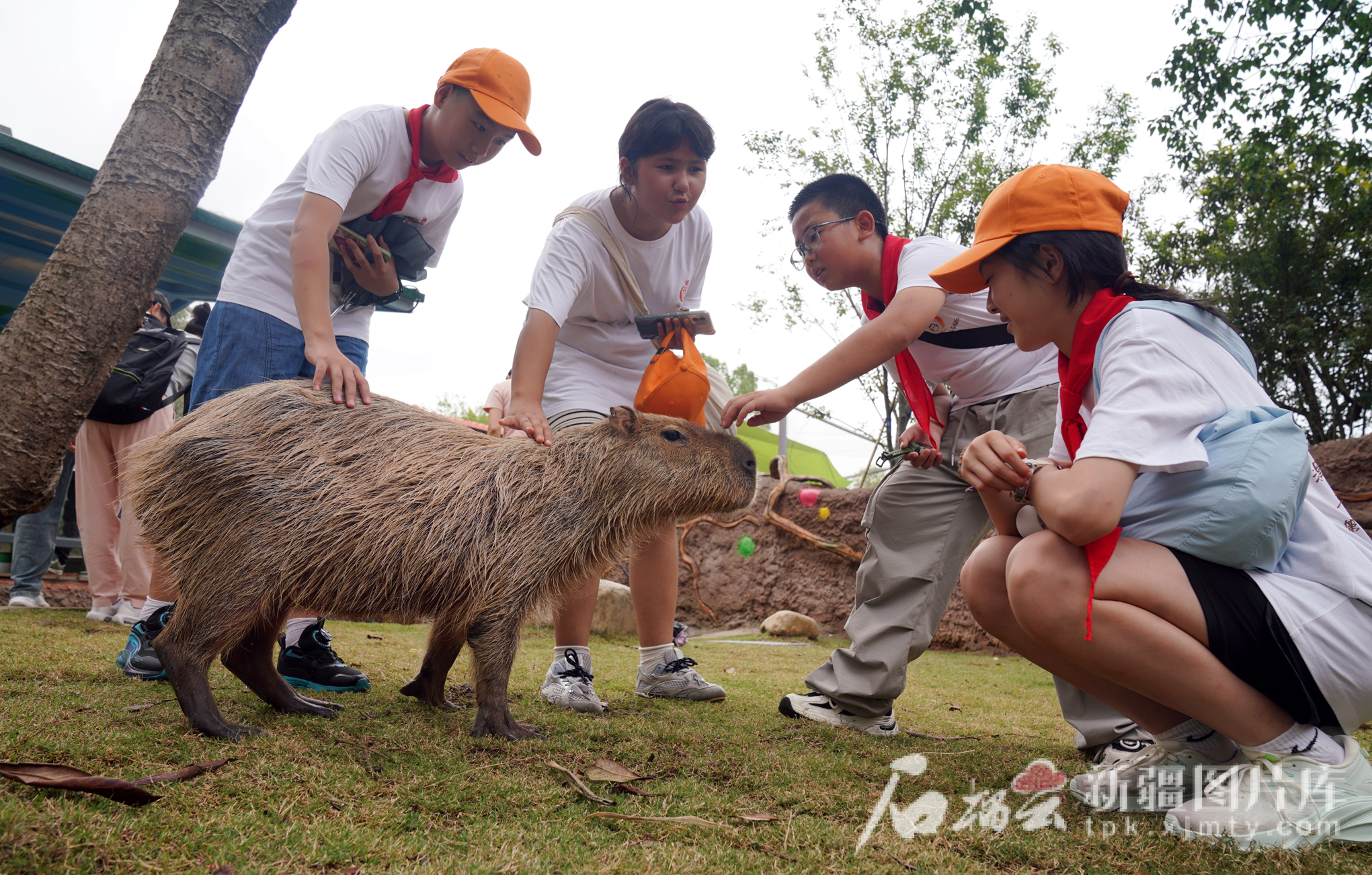 7月11日,在杭州野生動物世界,小伙伴們與溫馴呆萌的水豚(卡皮巴拉)親密接觸。