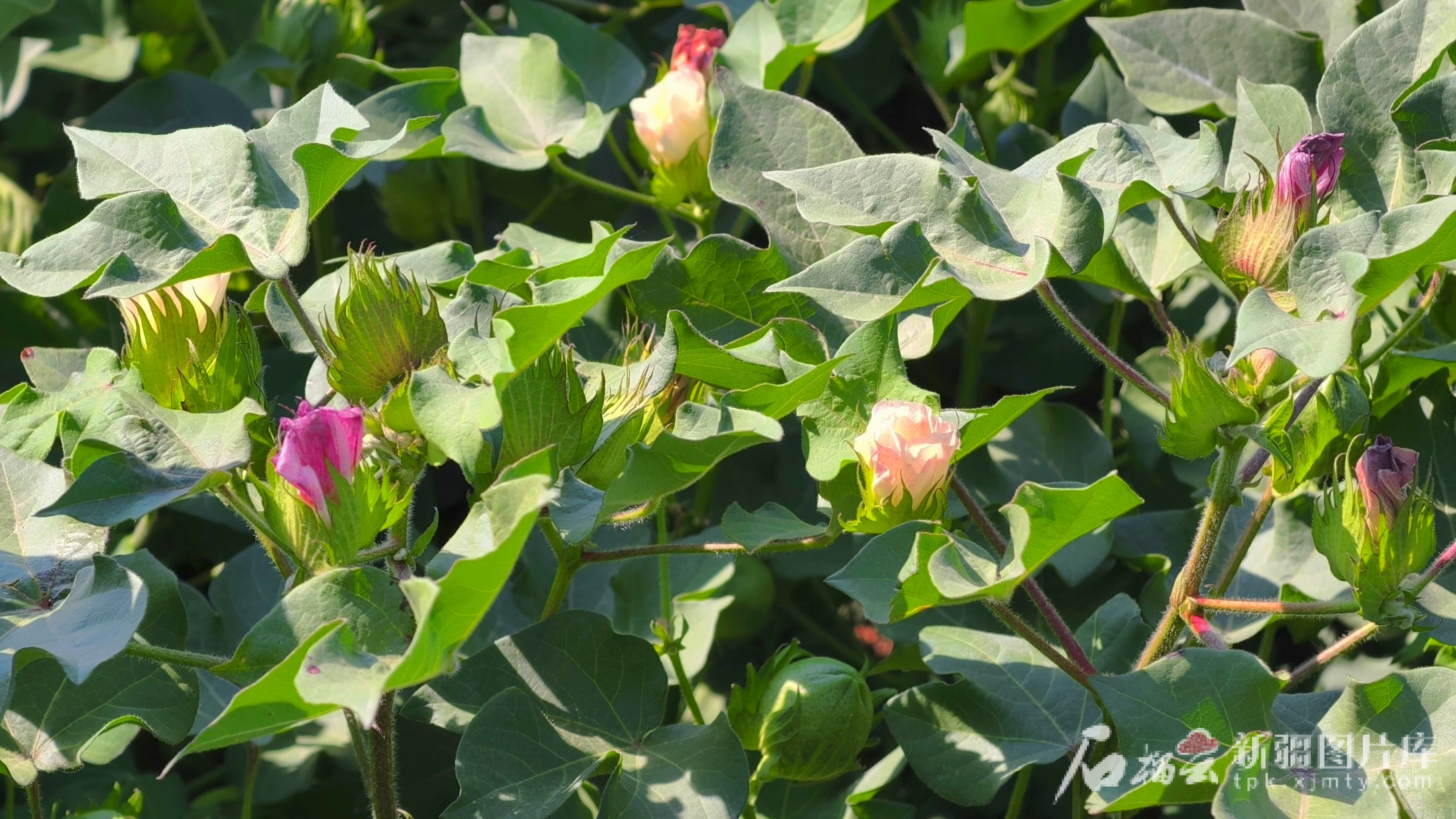 在棉花的花鈴期,這種變色現(xiàn)象直接關(guān)系到棉花的產(chǎn)量。“花鈴期是棉花從營(yíng)養(yǎng)生長(zhǎng)轉(zhuǎn)向生殖生長(zhǎng)的關(guān)鍵階段,開(kāi)花是否順利、結(jié)鈴是否飽滿(mǎn),直接影響最終收成?!遍Z夏輕輕撥弄著一朵深紫色的花,花托下方,已冒出了米粒大小的青綠色棉桃,“這朵紫色的花,傳粉過(guò)程基本完成了,它正為棉桃讓路。旁邊那朵剛開(kāi)的白花,還在等待昆蟲(chóng)授粉?!?/p>