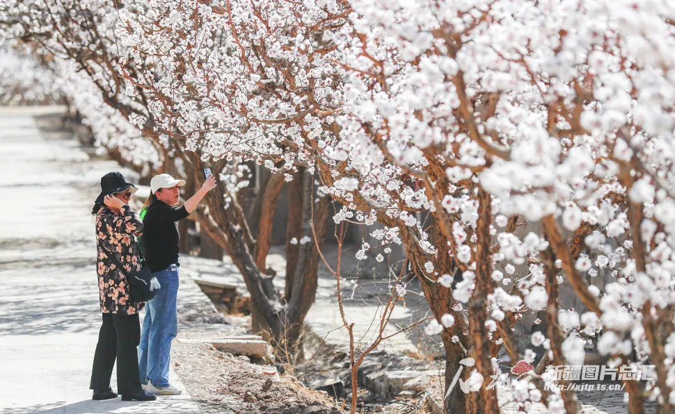 3月30日,游客在庫車市牙哈鎮(zhèn)托克乃村杏園合影留念。吐爾松·托胡提 攝