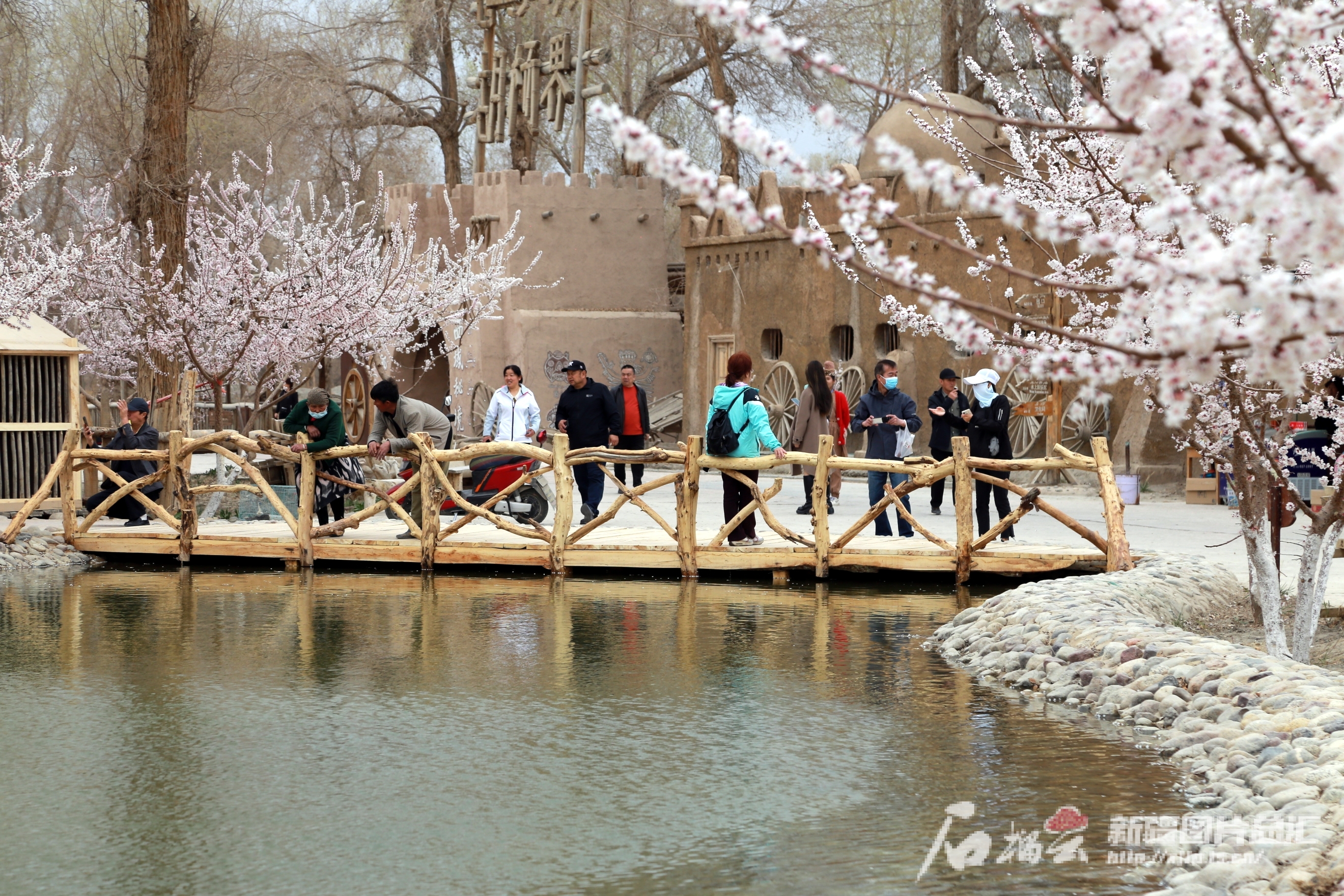 3月30日,游客在位于塔里木盆地邊緣的輪臺縣陽霞鎮(zhèn)一處杏園里觀光旅游。確·胡熱 攝