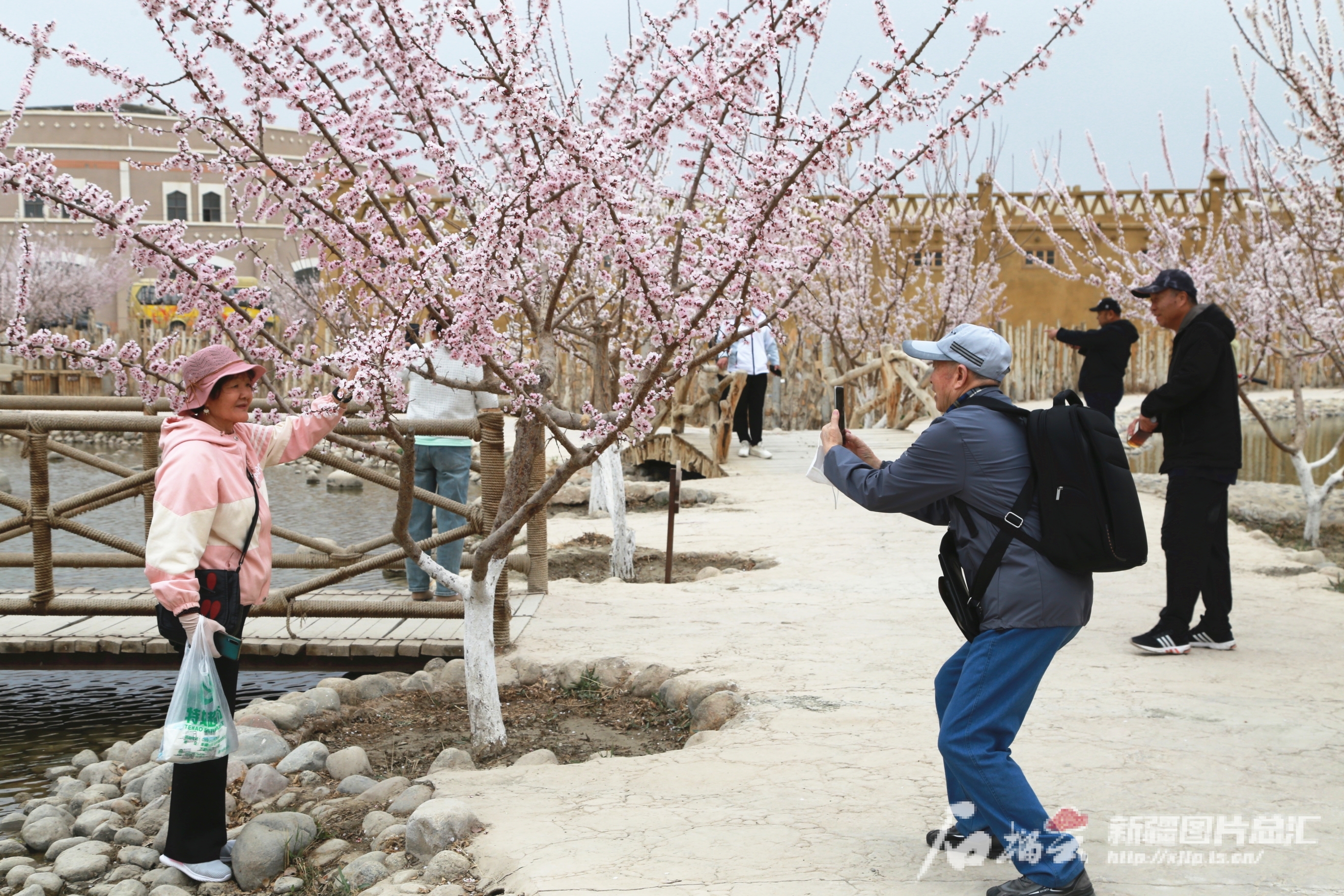 3月30日,游客在位于塔里木盆地邊緣的輪臺縣陽霞鎮(zhèn)一處杏園里拍照打卡。確·胡熱 攝
