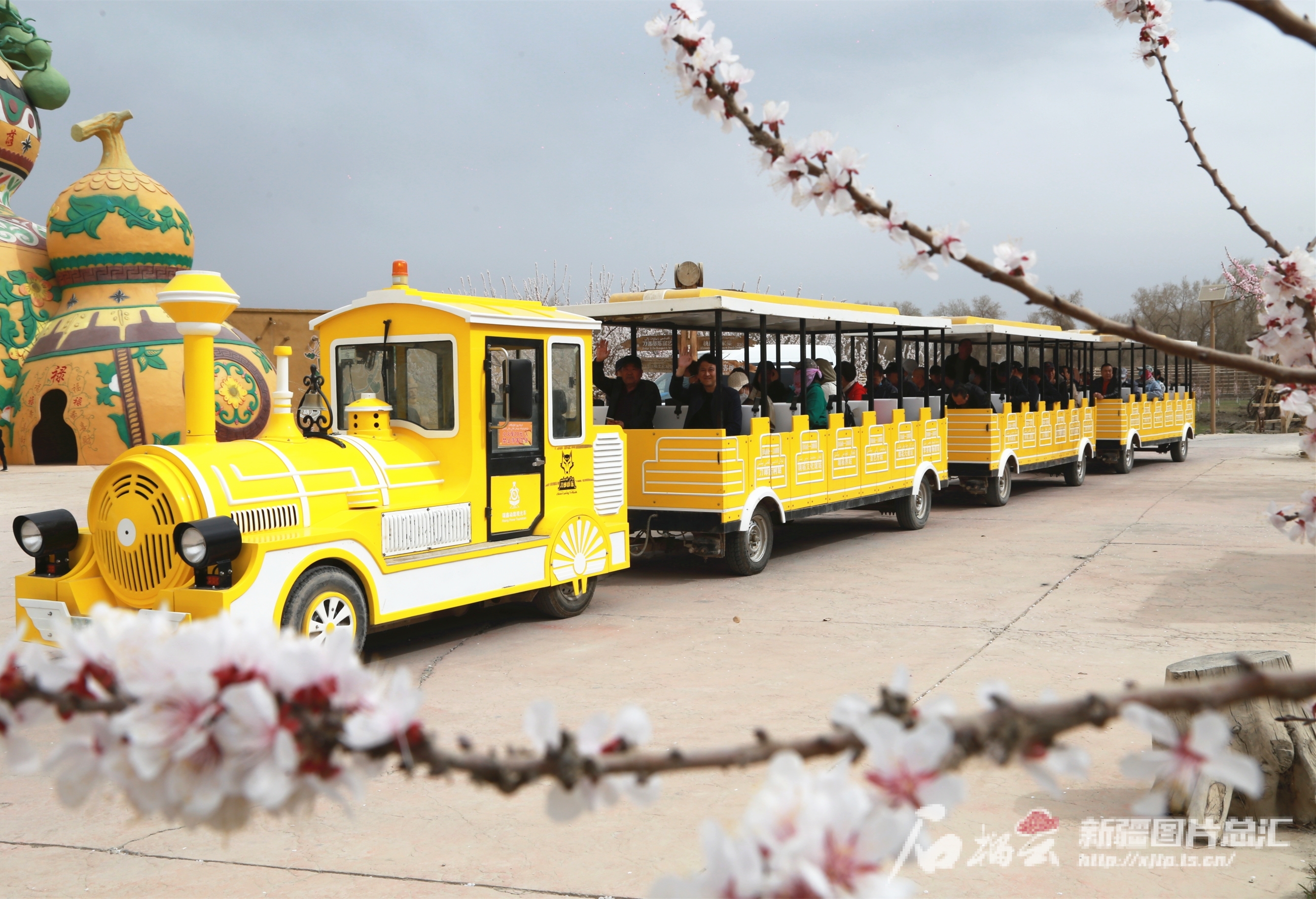3月31日,游客游客乘坐小火車欣賞阿瓦提縣刀郎部落景區(qū)杏花美景。包良廷 攝
