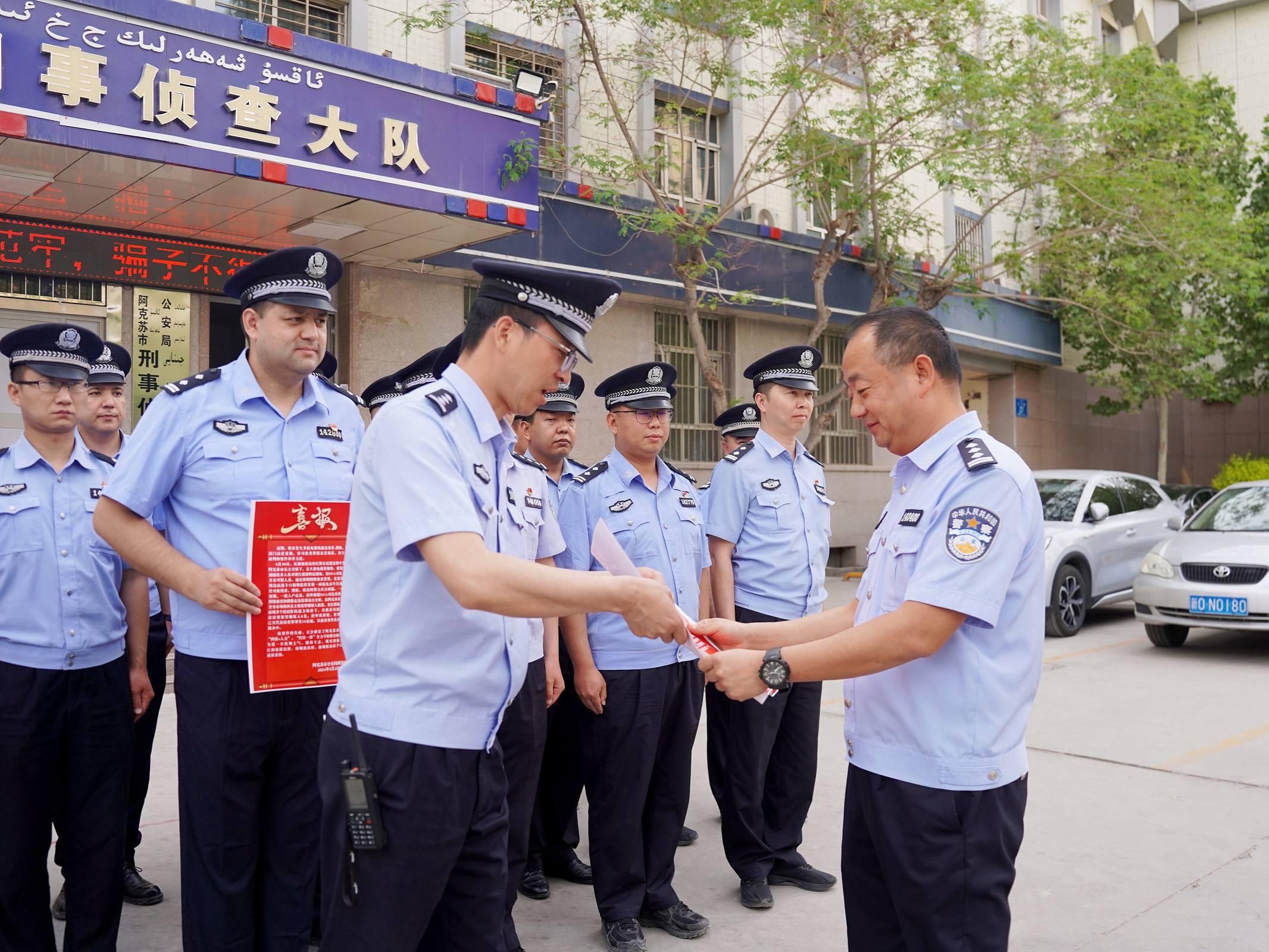 5月3日,阿克蘇市公安局開(kāi)展“送獎(jiǎng)到一線(xiàn)”活動(dòng),激勵(lì)更多青年民警奮發(fā)向前。李婕 攝