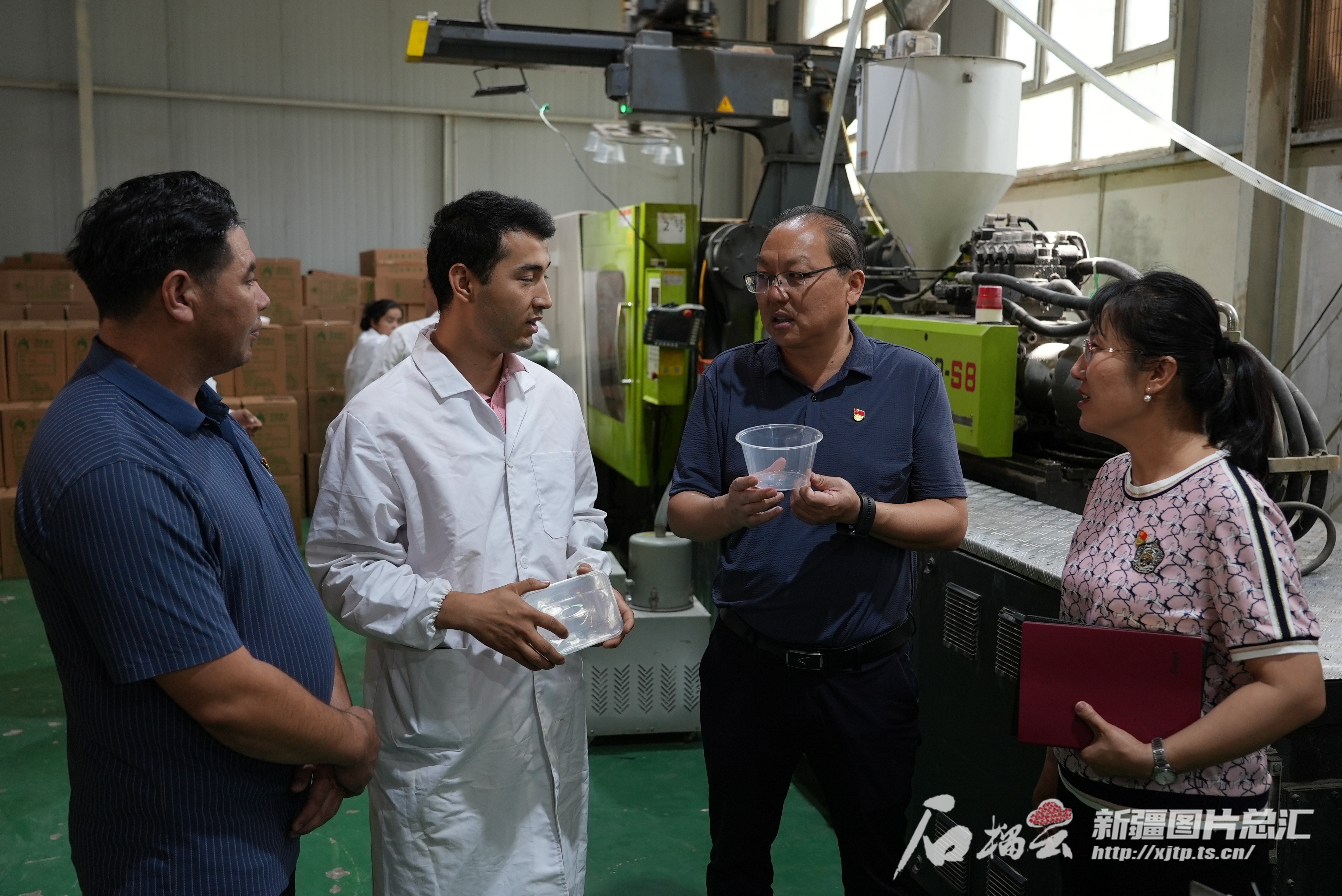 圖為自治區(qū)黨委宣傳部駐和田市肖爾巴格鄉(xiāng)阿依丁庫勒村第一書記、工作隊(duì)隊(duì)長蔡強(qiáng)(右二)正在村里餐盒廠指導(dǎo)工作。圖片由阿依丁庫勒村黨支部提供。