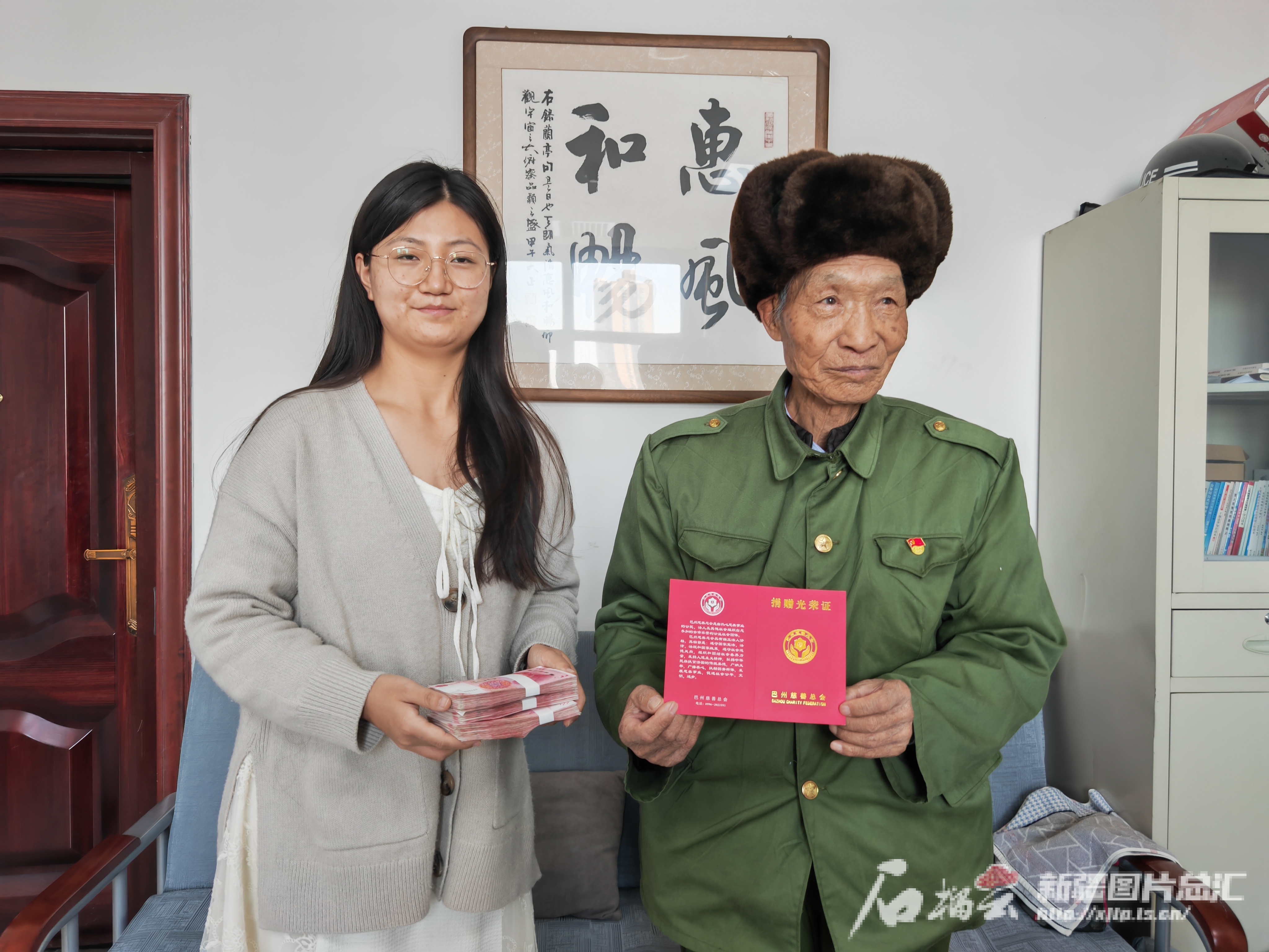 2023年12月21日,王成幫(右一)向積石山地震災(zāi)區(qū)捐款3萬元。庫爾勒市退役軍人事務(wù)局供圖