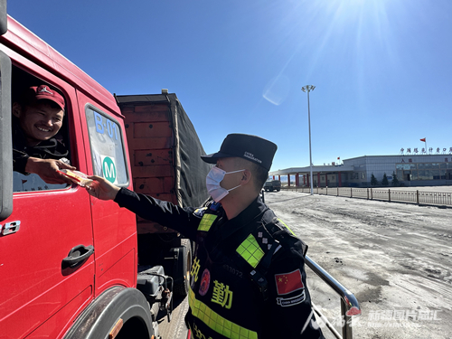 9月15日,塔克什肯出入境邊防檢查站民警向貨車司機(jī)贈(zèng)送月餅。李濤攝