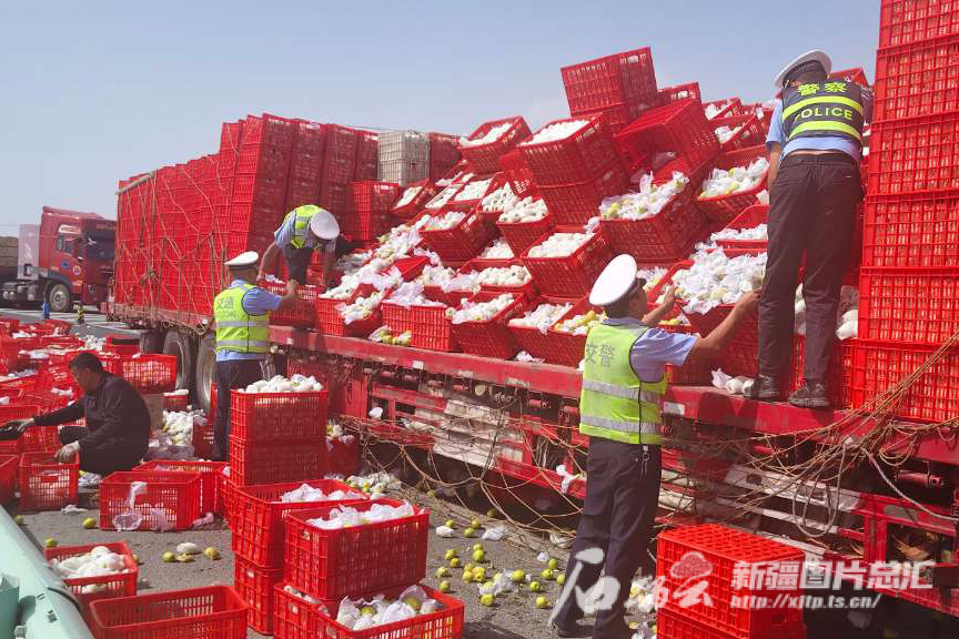 9月16日14時30分許,貨車司機侯先生駕駛一輛重型半掛牽引車行駛到G3012吐和高速陽霞服務區(qū)南出口時,因貨物未綁牢導致部分香梨散落在路上,嚴重影響過往車輛正常通行和行車安全。
