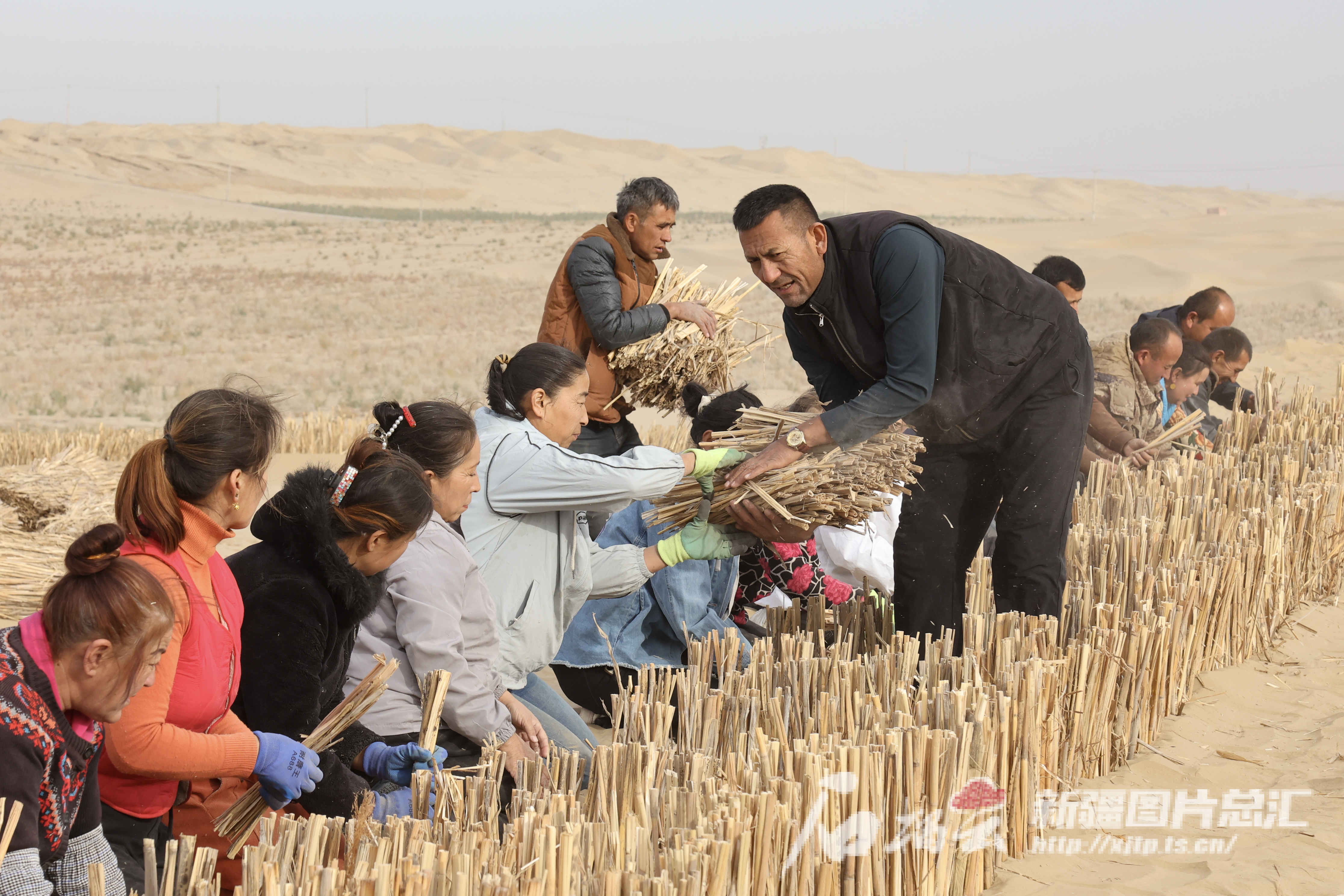 10月30日,參與治沙的群眾在于田縣奧依托格拉克鄉(xiāng)萬花園防沙治沙區(qū)鋪設(shè)草方格。